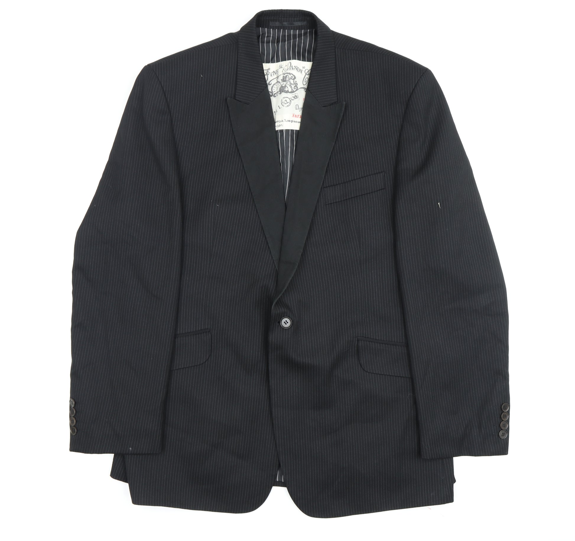 Step up your style game with this distinguished black blazer from The Fyne & Dandy Clothing Co. Designed for the modern gentleman, this piece offers a perfect blend of classic charisma and contemporary flair. Crafted in a smooth polyester-viscose blend, the blazer promises both comfort and durability, while its sleek striped pattern adds a touch of sophistication. Featuring a stylish single-breasted cut with a one-button front and notch lapels, the blazer exudes elegance and professionalism suitable for both business and formal occasions. The inner pockets enhance functionality, offering a practical solution for carrying essentials. This regular fit blazer has a regular length and a single-vented back for a comfortable, relaxed fit that sits impeccably well on the shoulders. Although in very good condition, there are slight fabric snags visible which do not detract from its overall appeal. Ideal for making a refined statement at autumn or spring occasions, this blazer is an ideal choice for the style-conscious man looking to make an impression. Elevate your wardrobe with this timeless piece and experience the confident elegance The Fyne & Dandy Clothing Co is known for today.