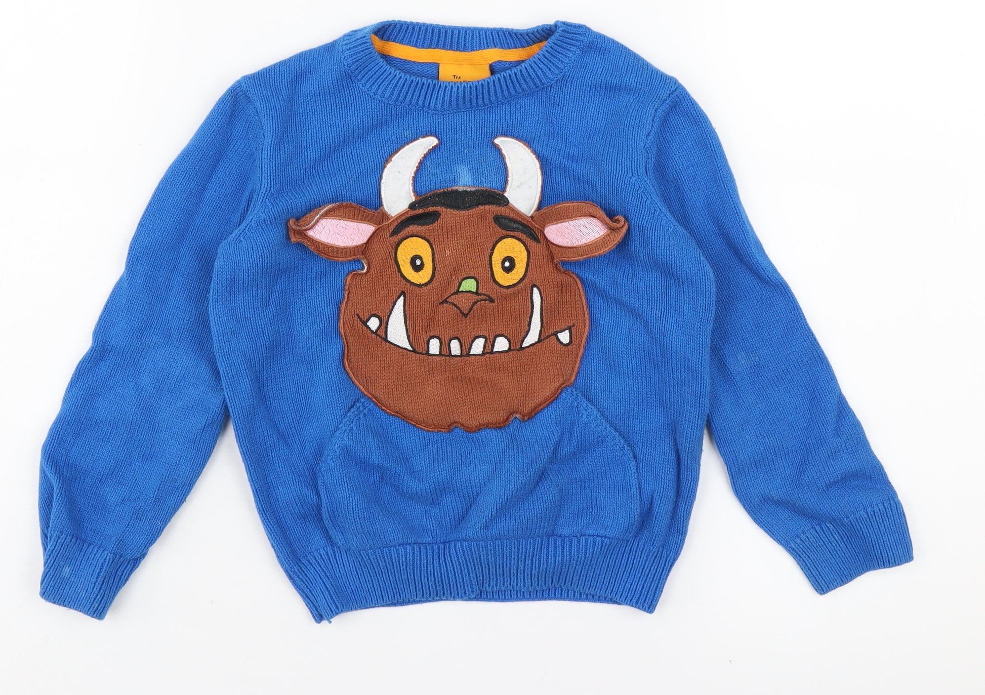 Dive into the whimsical world of 'The Gruffalo' with this charming boys' pullover jumper. Perfect for young fans, this vibrant blue knit is not only a delightful addition to any wardrobe but also provides comfort with its 100% cotton fabric. The front features a striking graphic of the beloved Gruffalo character, bringing stories to life every time it's worn. Designed with a crew neck and long sleeves, this jumper is an excellent choice for colder months, making it ideal for autumn and winter wear. The jumper, suitable for boys aged 4-5 years, offers a regular fit that ensures freedom of movement whether at play or during casual outings. Machine washable and made from tight-knit cotton material, it promises durability and easy care, perfect for active young ones. Elevate your child's style and allow them to enjoy the comfort and fun of this enchanting Gruffalo-themed jumper. Whether for a quiet day indoors or a trip to the park, this piece is sure to attract smiles and compliments.