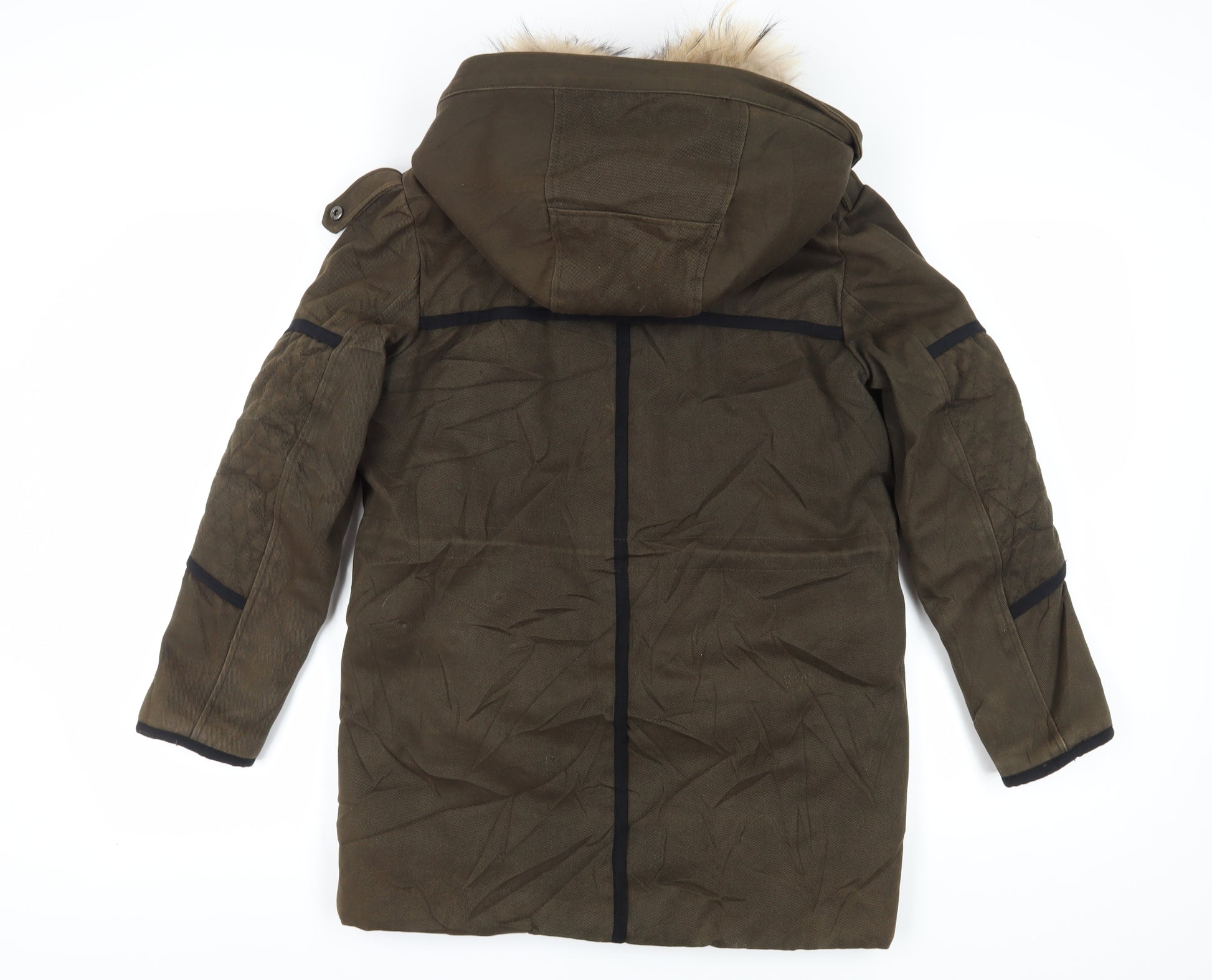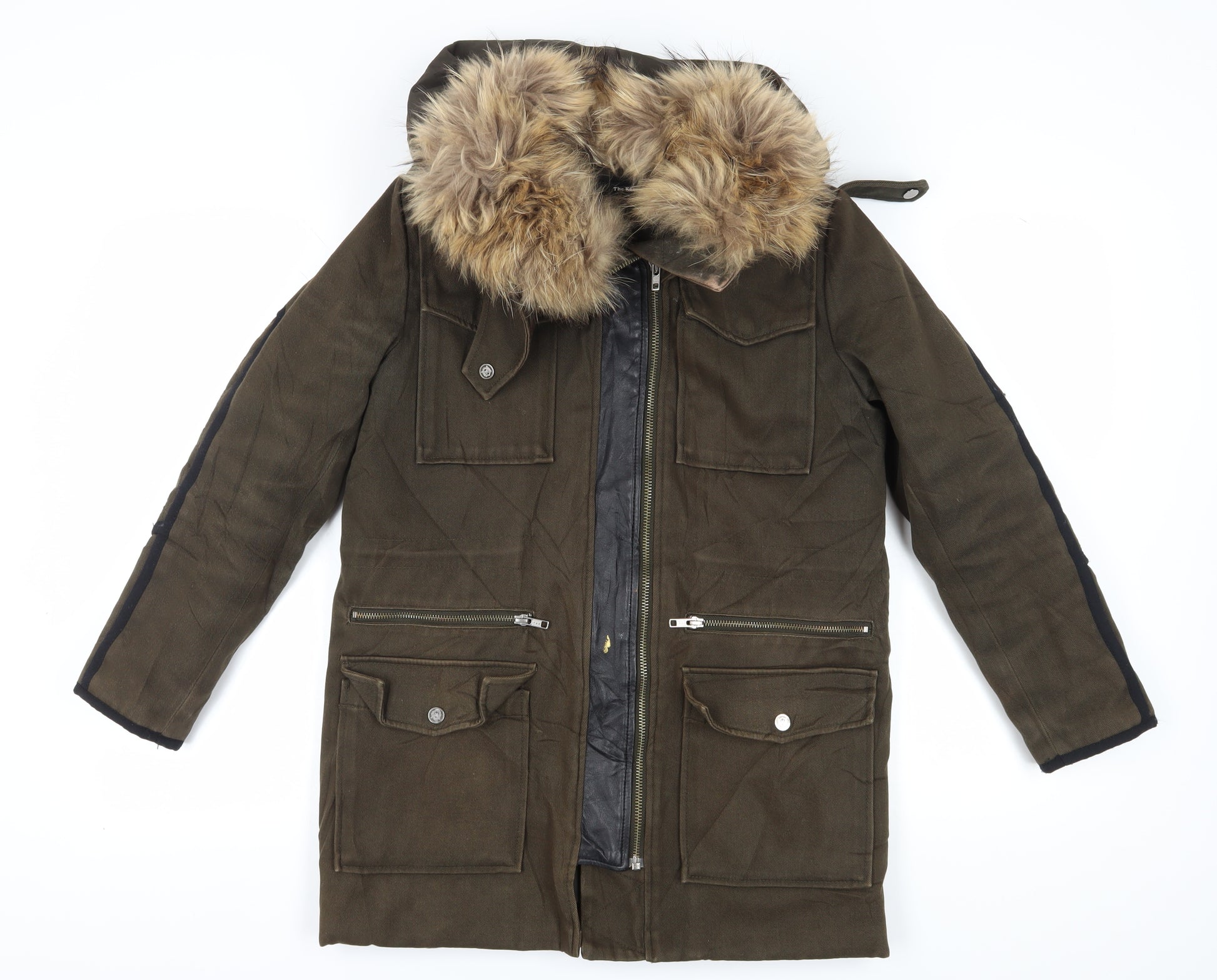 Embrace the chill with this stylish Kooples parka coat. Designed for the modern woman, this brown cotton and polyester blend coat is crafted to keep you warm during chilly autumn and winter days. The long length and fur-trimmed hood add a touch of class, making it ideal for casual outings or travel. The zippered pockets provide convenience, while details like the button and zip accents enhance its chic appeal. This coat ensures a comfortable fit and its classic theme promises sophistication. Please note minor marks and a discreet paint smudge inside, lending character to this gently used piece.