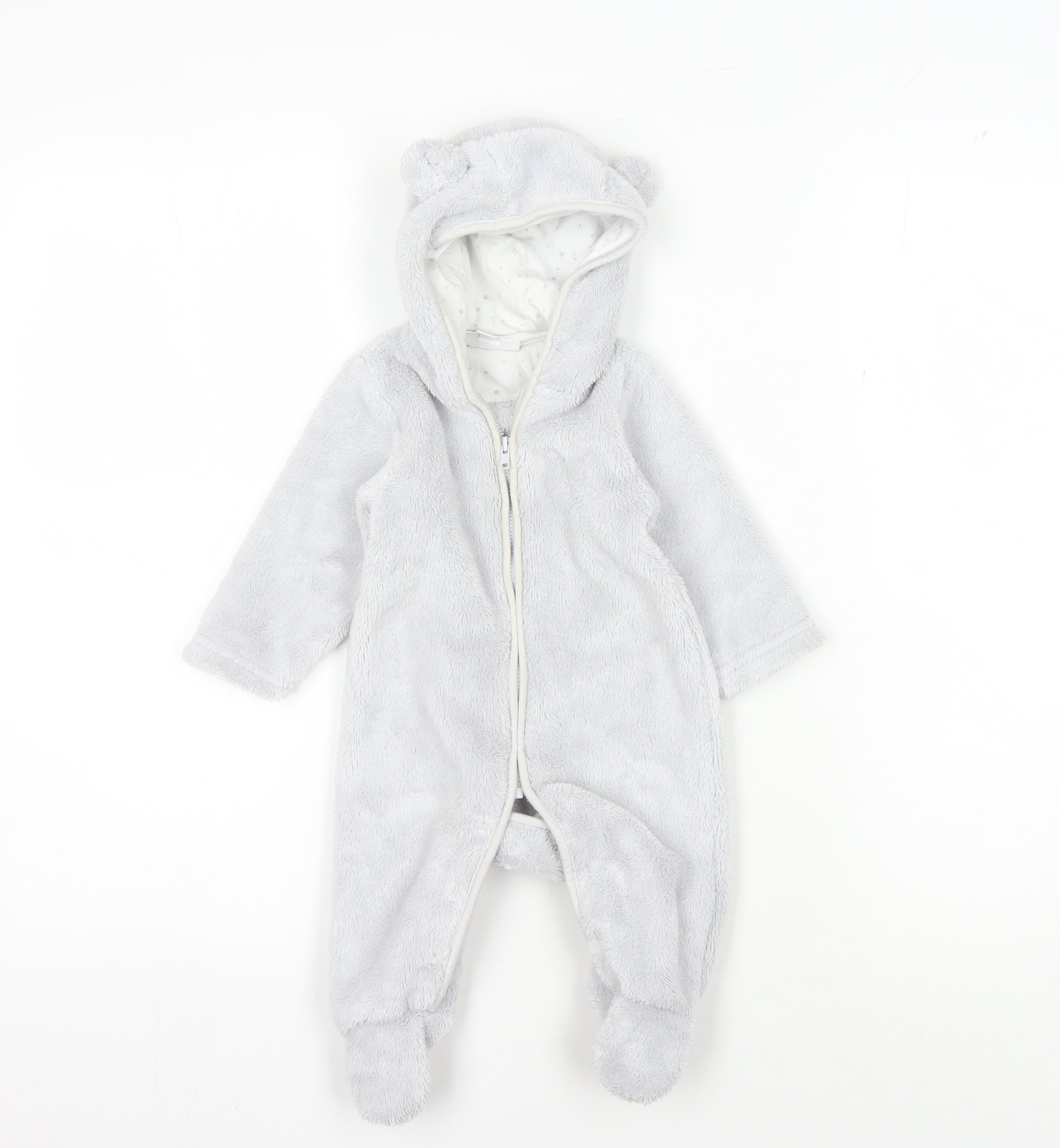 Keep your little one snug and cosy in this adorable unisex grey babygrow from The Little White Company. Suitable for babies aged 3-6 months, this charming outfit is crafted from a plush polyester fleece for outer warmth, lined with soft cotton to ensure comfort against your baby's delicate skin. Perfect for autumn and winter, this hooded one-piece features cute ear accents on the hood, adding a touch of fun and whimsy. The zip closure ensures easy dressing and changing, making it a practical choice for busy parents. Ideal for casual wear, it boasts a timeless unfussy pattern and a classic round neckline. Machine washable for your convenience, this babygrow combines style, comfort, and functionality in one elegant piece. Perfect for playdates, outings, or just cuddling at home, it makes a delightful addition to any baby's wardrobe.
