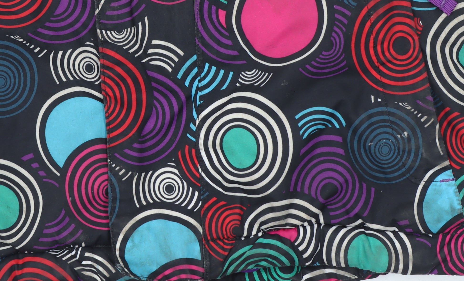 Brighten up dreary days with this striking The North Face girls’ hooded puffer jacket. Crafted from a durable polyester shell and soft nylon lining, this jacket ensures lasting comfort and dependable protection against chilly winds and light rain. The jacket’s lightweight yet insulated design makes it a great choice for school runs, walks, and weekend adventures. Featuring a lively multicoloured geometric pattern with circles in purple, pink, turquoise and red tones, it adds a playful yet stylish vibe to any outfit. The hood offers extra warmth when the weather decides to change, while the full zip closure provides easy wearability. The jacket also includes practical side pockets, perfect for keeping hands cosy or stashing small essentials. Designed with versatility in mind, it’s ideal for both winter and autumn wear thanks to its insulating polyester fill that keeps the warmth in without feeling too bulky. This piece shows minor signs of previous wear with a few light marks near the hem, but it remains in good overall condition with plenty of life left in it. A highly functional coat from a quality outdoor brand known for performance and reliability, it’s both practical and fun. Whether for outdoor play, day trips, or casual daily wear, this jacket promises warmth, comfort and standout style. Machine washable for easy care, it’s a great choice for active girls who love bright colours and adventure. This The North Face puffer jacket combines dependable protection with bold design, making it a perfect blend of style and everyday function. A cheerful jacket that’s sure to be a favourite wardrobe pick through the cooler seasons.