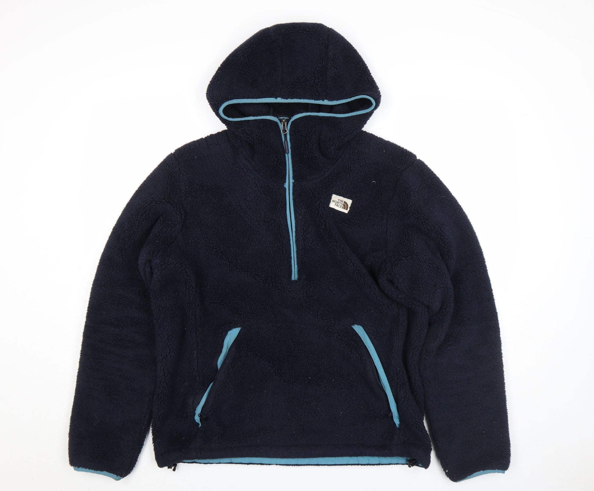 Stay comfortably warm and effortlessly stylish with The North Face Men’s Blue Fleece Hoodie in size Large. Crafted from soft, high-quality 100% polyester fleece, this pullover offers superior insulation and breathability, designed to keep you comfortable in cooler conditions. Its deep navy blue colour with contrasting light blue trim and elbow patches adds a touch of technical outdoor appeal. The design features a classic 1/4 zip closure at the neckline for adjustable ventilation and easy wear, complemented by a drawstring hem ensuring a snug fit to keep out the chill.The hood is warm and protective, ideal for unpredictable weather, while the two roomy zipped front pockets provide ample space to keep your hands warm or store small essentials on the go. The fleece material ensures maximum comfort and warmth without excessive bulk, making it perfect for layering under a waterproof shell or wearing alone on milder days.Practicality meets outdoor performance with features like the breathable fleece fabric, secure zipped pockets, and a durable zip closure. Its regular fit and long sleeves make it suitable for everyday wear, outdoor adventures, hiking, walking, or casual weekend outings. This hoodie embodies The North Face’s renowned commitment to quality, function, and timeless outdoor style.In very good pre-owned condition, showing only minor signs of wear consistent with gentle use, this piece offers great value for anyone looking for a premium fleece hoodie at a fraction of the original cost. Ideal for autumn and winter, this versatile garment will quickly become a go-to favourite whether you’re out on the trail or relaxing at home.A perfect choice for men who appreciate comfort, durability, and the trusted performance of The North Face, this hoodie delivers both warmth and classic outdoor style in one essential piece.