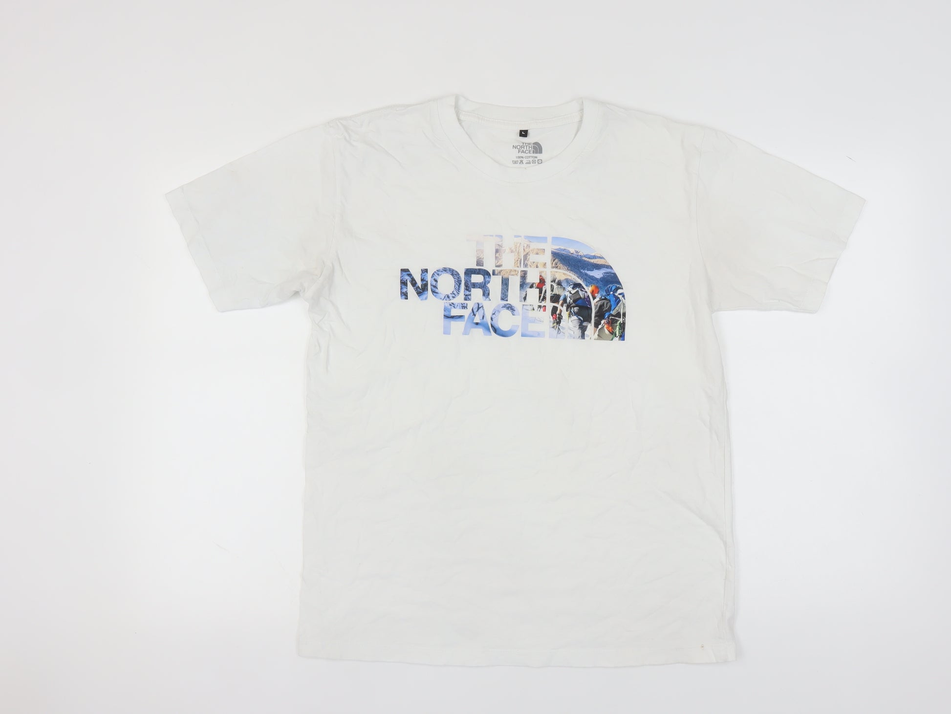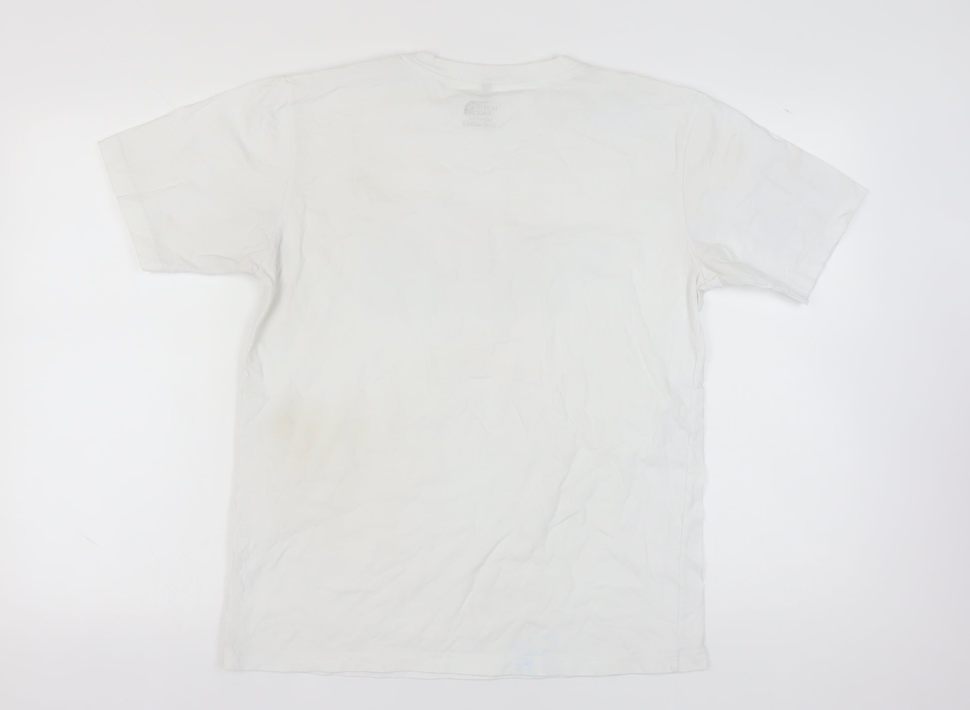 This stylish and comfortable The North Face Men's T-Shirt in size Large offers a classic crew neckline and short sleeves, perfect for everyday wear. Made from 100% Cotton, this white T-shirt provides a soft and breathable fabric that ensures all-day comfort. The standout feature of this T-shirt is its eye-catching graphic print of The North Face logo, adding a touch of adventure to your outfit. With its regular fit and jersey fabric, it provides a relaxed yet fashionable look that can easily be paired with jeans or shorts. Ideal for all seasons, this machine-washable T-shirt brings a touch of iconic outdoor spirit to your wardrobe. However, please note there are slight blue marks present, which have been factored into the pricing. A perfect addition for fans of The North Face or for anyone looking to enhance their casual attire.