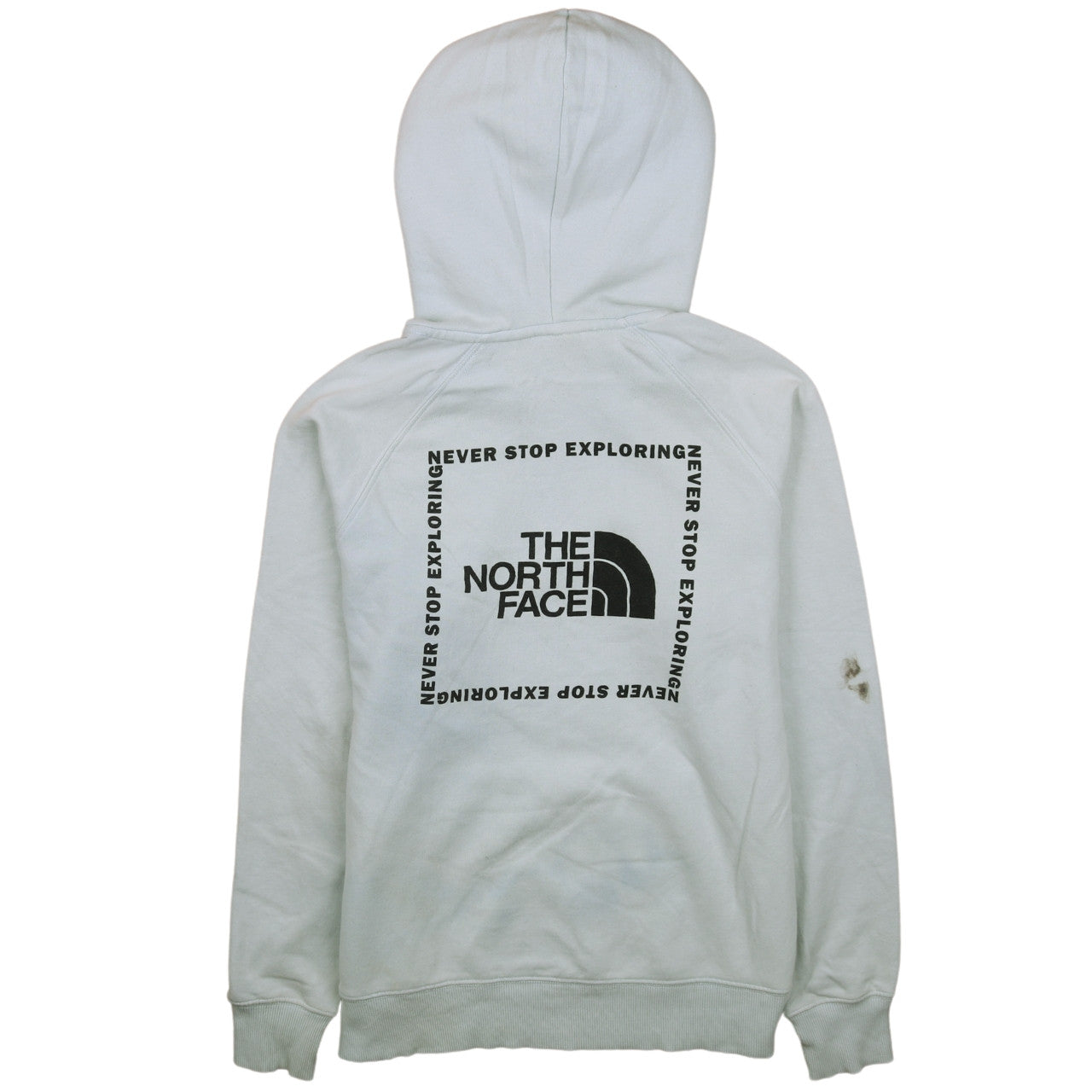 Stay cosy and look effortlessly stylish with this The North Face unisex pullover hoodie in classic white. Designed with The North Face’s signature quality and appeal, this hoodie features a bold logo print on both the chest and back with the brand’s enduring motto 'Never Stop Exploring'. Crafted from a soft cotton and polyester blend fleece, it provides both warmth and comfort, making it perfect for cooler days and laid-back outdoor adventures. The adjustable drawstring hood and kangaroo pocket offer practicality and relaxed style, while the ribbed cuffs and hem ensure a secure and comfortable fit. This hoodie is lightweight yet insulating, ideal for layering during autumn, winter, or early spring seasons. Its versatile white tone pairs seamlessly with jeans, joggers, or shorts, suitable for casual wear, travel, or outdoor activities like hiking and walking. Despite some light marks on the sleeve and hood, the hoodie remains in good wearable condition with plenty of life left. Perfect for those who love comfort without compromising style, this North Face hoodie is both functional and fashionable. A great addition to any wardrobe, it provides everyday durability and timeless appeal synonymous with The North Face brand. Whether you’re heading outdoors or relaxing at home, this hoodie delivers warmth, versatility, and an iconic look that never goes out of style.