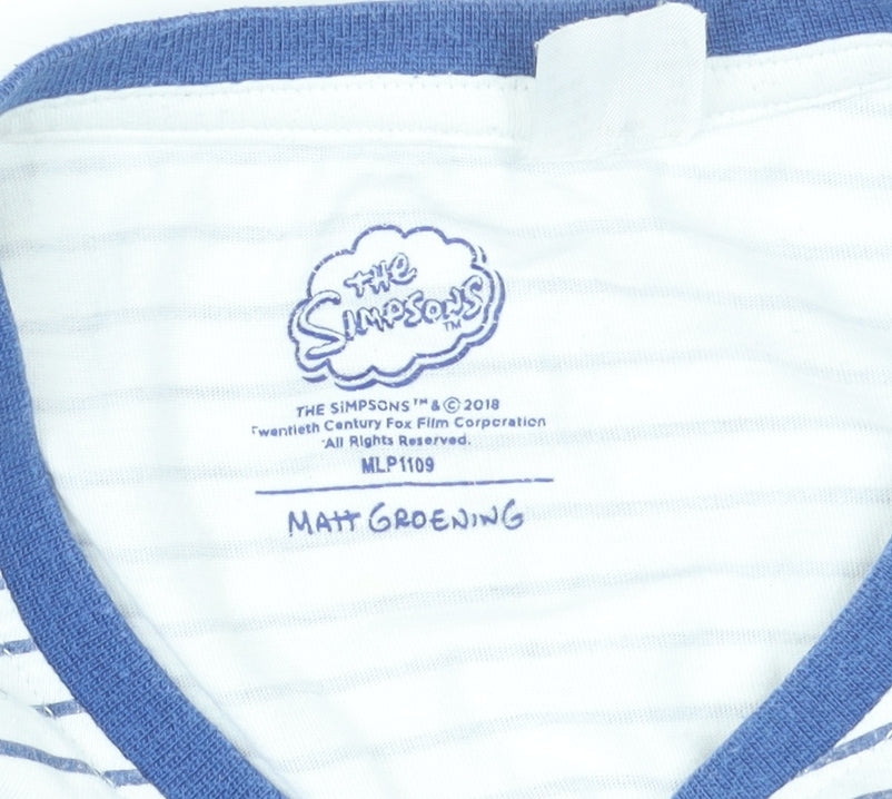 Add a touch of nostalgia and playful style to your child’s wardrobe with this delightful The Simpsons girls’ T-shirt. Featuring Bart Simpson in a fun surfing pose, this top brings a cheerful and cheeky vibe perfect for casual, everyday wear. Crafted from 100% soft and breathable cotton, it ensures lasting comfort and durability, making it ideal for school days, lounging at home, or summer outings. The blue and white striped print is simple yet stylish, while the contrast blue crew neck trim adds an extra touch of charm. Designed for girls aged 14 years, this short-sleeved shirt offers a regular fit that provides ease of movement for active wearers. The lightweight jersey material is gentle on the skin and machine washable, ensuring easy care and maintenance. Whether paired with shorts, jeans, or a skirt, this top is incredibly versatile and can be styled effortlessly. The bold “Bart Surf” graphic on the front adds a splash of humour and classic 90s spirit, appealing to fans of the iconic animated series. With its timeless cartoon print and comfortable feel, this piece strikes the perfect balance between fun and practicality. The shirt remains in excellent condition, showing minimal signs of wear and maintaining its original vibrant colours. A must-have addition for any young fan of The Simpsons or for anyone who loves vintage-inspired cartoon designs, this top makes a fantastic gift or wardrobe staple. Don’t miss out on this chance to own an officially licensed 2018 The Simpsons tee — an instant classic full of character, comfort, and cool retro style.