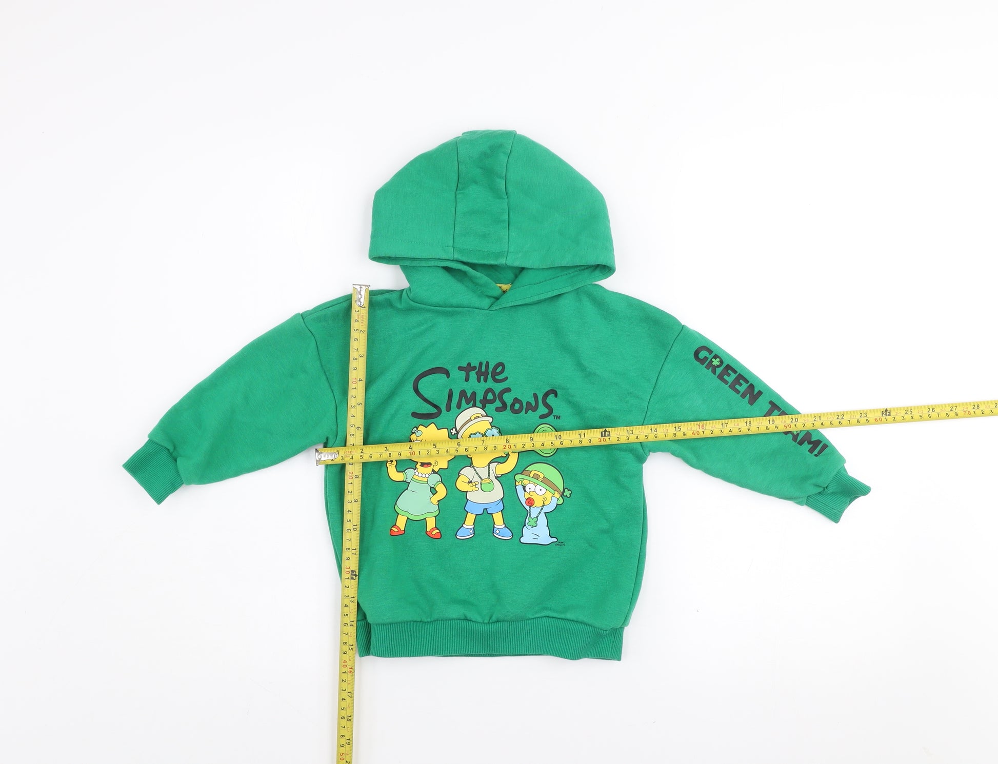 Brighten up your child’s wardrobe with this fun and vibrant boys’ green hoodie featuring beloved characters from The Simpsons. Perfect for young fans, this pullover hoodie showcases Lisa, Maggie, and Marge on the front alongside the playful slogan 'Green Team!' printed down the sleeve. Made from a soft and durable 60% cotton and 40% polyester blend, it ensures comfort, warmth, and ease of movement, making it ideal for everyday wear or casual outings. The cosy fleece inner layer offers extra warmth, making this hoodie great for chilly days in spring, autumn, or winter. The ribbed cuffs and hem provide a snug fit, while the attached hood adds practical charm and style. With its eye-catching cartoon print and cheerful colour, this hoodie captures the personality of kids who love animated classics and eco-friendly themes. A versatile choice, it pairs effortlessly with jeans, joggers, or shorts for a laid-back, trendy look. Sized for ages 3–4 years (104 cm), it’s designed for comfort and style—perfect for school days, outdoor adventures, or relaxing at home. In excellent pre-owned condition with no visible marks, stains, or tears, this hoodie has been lovingly cared for. It does not have the original sales tag but remains in fantastic shape, ready for its next little fan. A must-have for young Simpsons enthusiasts and anyone looking to add a dash of fun and nostalgia to their child’s clothing collection. Comfortable, practical, and filled with character, this piece is both collectible and wearable, sure to be a favourite in your kid’s wardrobe.