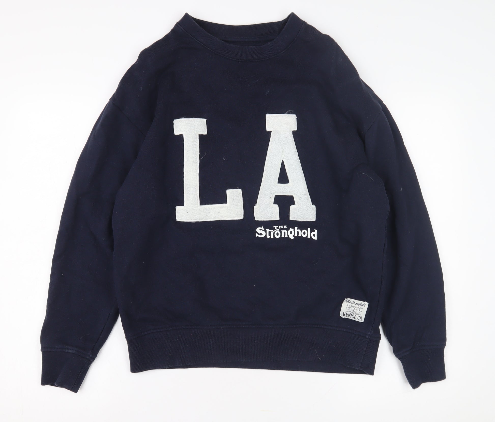 Elevate your casual wardrobe with this stylish The Stronghold sweatshirt, perfect for men who appreciate effortless style and comfort. Crafted from high-quality cotton, this blue pullover features a classic crew neck and long sleeves, ensuring warmth and comfort during the autumn and winter months. The jersey fabric provides a soft, breathable feel, ideal for all-day wear.Emblazoned with a prominent 'LA' logo on the front, this sweatshirt exudes a cool urban vibe, perfect for city lovers and enthusiasts. The graphic print accentuates its modern appeal, making it a versatile choice for casual outings, whether you're exploring the city or lounging at home.Designed with a regular fit, this sweatshirt caters to those who prefer a relaxed yet stylish silhouette. The ribbed cuffs and hem enhance its fit, providing a snug wear that flatters every frame. Machine washable for easy care, it ensures longevity and retains its vibrant colour even after multiple washes.Though lacking original sales tags, the piece is in excellent used condition with only slight signs of wear, adding to its character without compromising its quality. It's a must-have addition to your wardrobe, offering a blend of comfort, style, and practicality, with the City theme adding a unique touch to its design.Perfect for pairing with jeans or casual trousers, this sweatshirt is a staple for any modern wardrobe. Experience the effortless combination of style and comfort with The Stronghold's sweatshirt, a piece that promises to not only meet but exceed your expectations. Add it to your collection today and enjoy unparalleled street style.