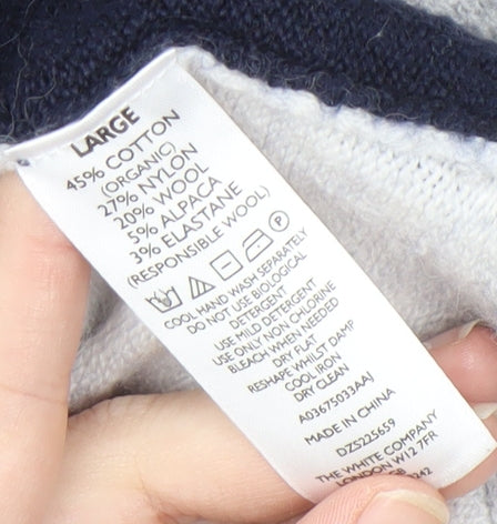 Explore the elegance and comfort of this Women's Cardigan by The White Company. Crafted to provide a versatile and stylish addition to your wardrobe, this cardigan is the perfect blend of elegance and practicality. It's made from high-quality materials including cotton, nylon, wool, and alpaca, ensuring not only a luxurious feel but also durability. The added elastane offers a comfortable stretch, making it a delightful choice for everyday wear. Its classic button accent adds a touch of sophistication while the multicoloured design provides versatility to complement various outfits. Enjoy the warmth of long sleeves that cater to your comfort during cooler seasons. Though free of patterns, this cardigan boasts a stylish simplicity that's perfect for casual occasions. Enjoy the luxurious knit fabric type for an additional layer of warmth and softness. It's a regular fit for women, appropriate for a wide range of body types. Note the item is in very good condition, with minor discolouration visible and no tags attached. It's ideally suited for casual occasions, matching beautifully with jeans, trousers, or a skirt. Whether at home or out and about, this cardigan covers your styling needs while promising comfort and warmth.