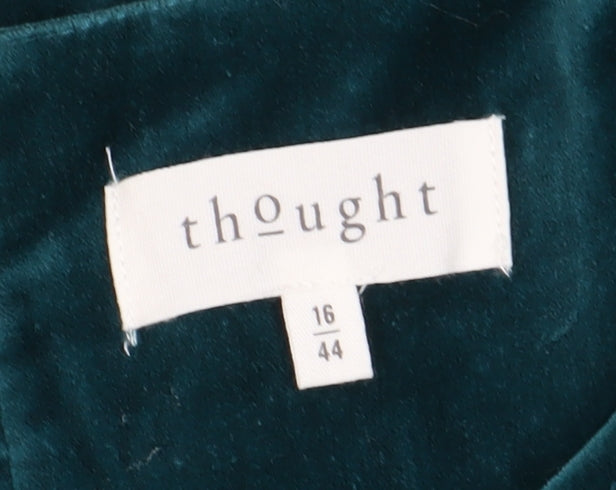 Indulge in the luxurious feel of this Thought Women's Velvet Shift Dress, perfect for adding a touch of elegance to your wardrobe. Crafted from a rich green velvet fabric with a composition of 97% cotton and 3% elastane, this dress offers a soft and comfortable fit while maintaining its shape. The scoop neckline and sleeveless design make it ideal for layering or wearing alone during the cooler autumn and winter months. Designed with practicality in mind, this dress features convenient pockets, ensuring that functionality meets style. Its knee-length cut and sleek shift silhouette offer a versatile fit that flatters various body types, making it an excellent choice for casual outings or low-key gatherings. With a simple zip closure at the back, it’s easy to slip into and provides a smooth, seamless look. The Thought brand emphasizes versatility and comfort, making this dress a staple piece in any woman's wardrobe. Whether paired with tights and boots for a cozy autumn look or dressed up with heels and statement accessories, this dress promises endless styling possibilities. In excellent condition with only minor signs of wear, this dress is ready to become a beloved part of your collection. Elevate your everyday style with this timeless and chic green velvet shift dress.