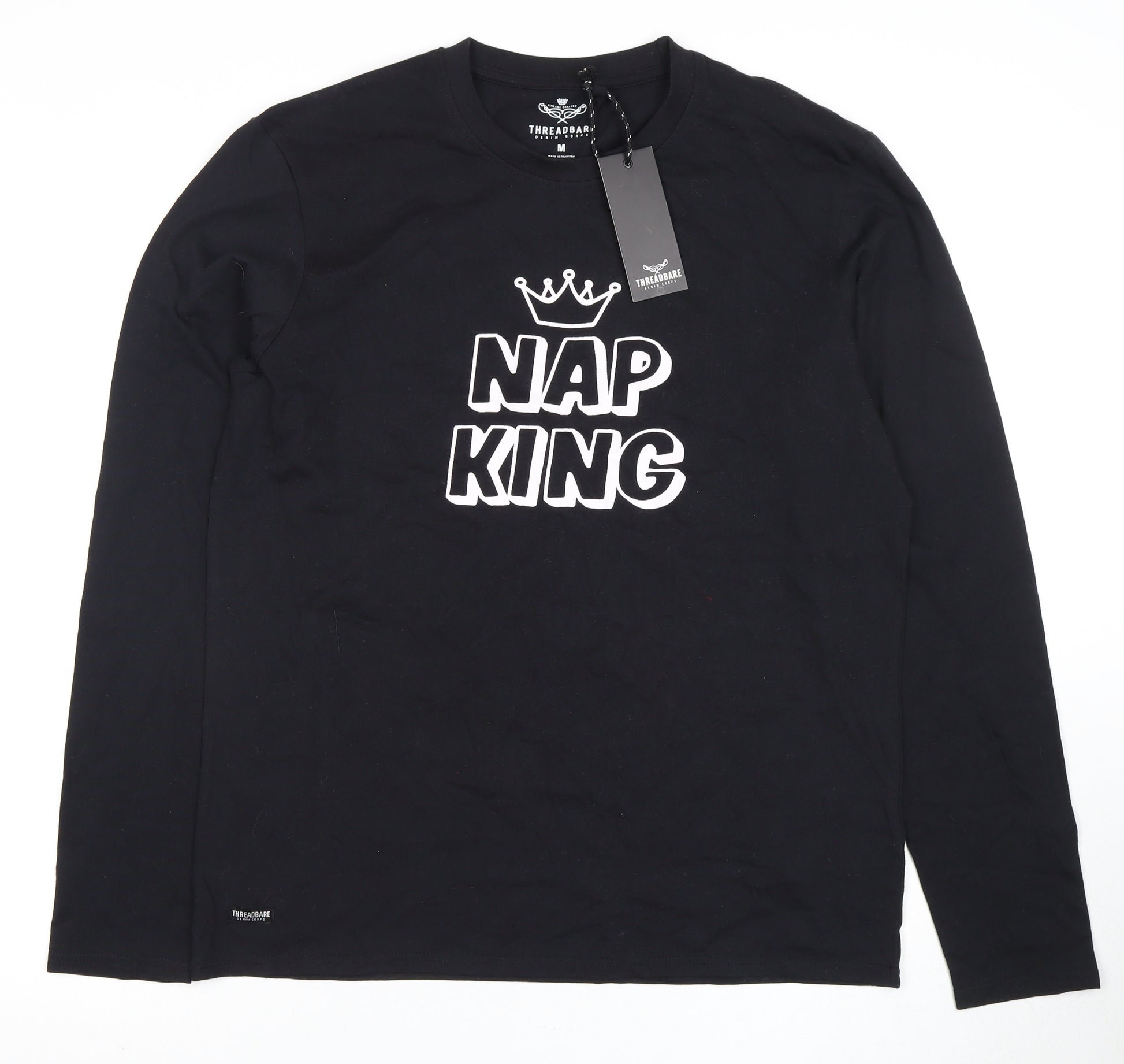 Embrace comfort and style with the Threadbare 'Nap King' Pyjama Top for men. Crafted from premium 100% cotton, this long sleeve pyjama top is perfect for keeping you cosy throughout the night. Its simple black design is accentuated with a playful 'Nap King' graphic print, making it not just comfortable but also fun to wear. This medium-sized top is part of a two-piece set that ensures you have everything you need for a restful sleep. The round neckline adds a classic touch, while the machine-washable fabric offers easy maintenance, making it a convenient choice for everyday use. Whether you're lounging around or gearing up for a good night's sleep, this pyjama top is your go-to choice. Designed specifically for men, its regular size fit ensures comfort without compromising on style. The 'Nap King' top is perfect for those lazy weekend mornings or an evening of relaxation. Make lounging stylish and enjoyable with this essential piece from Threadbare.