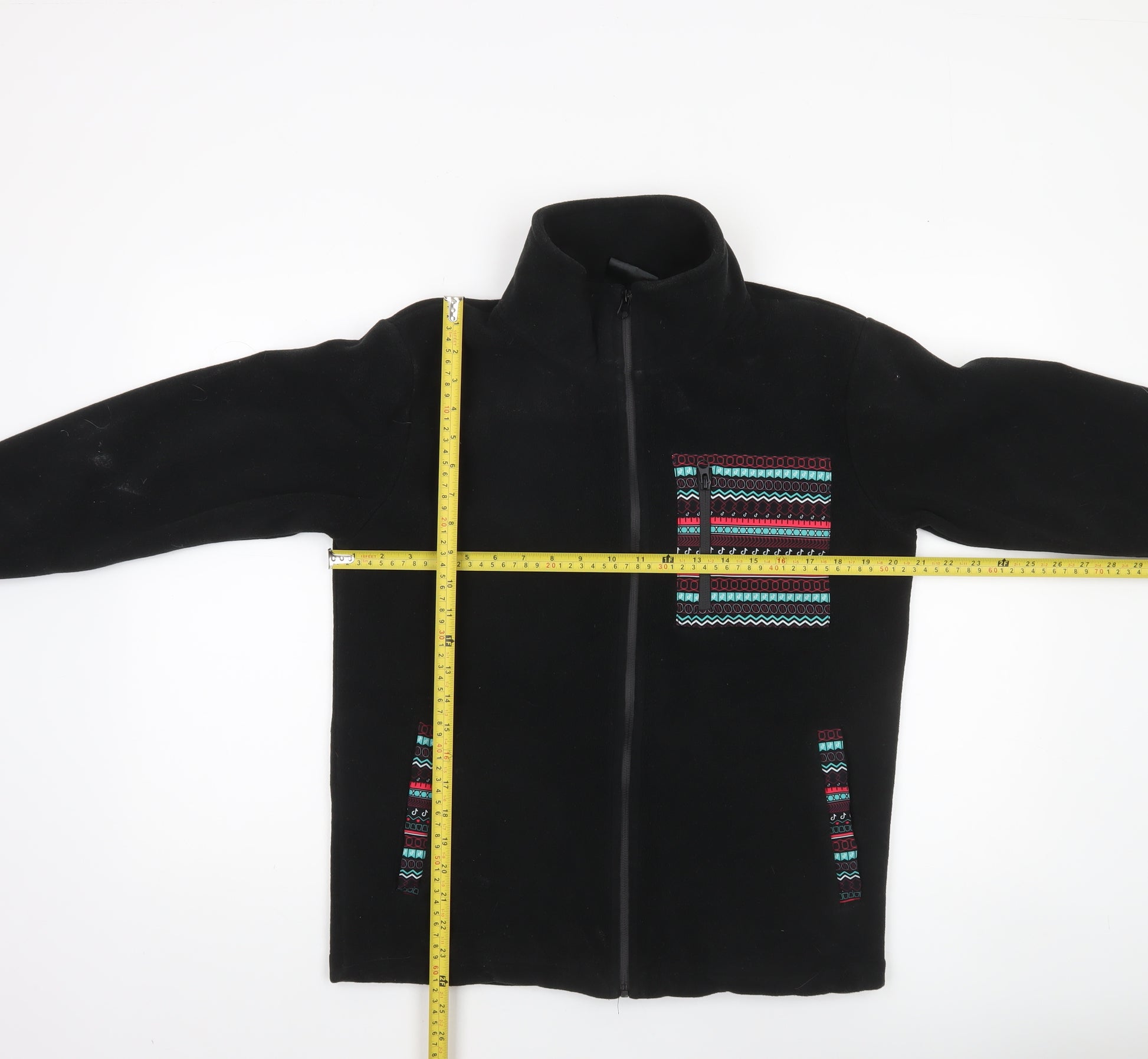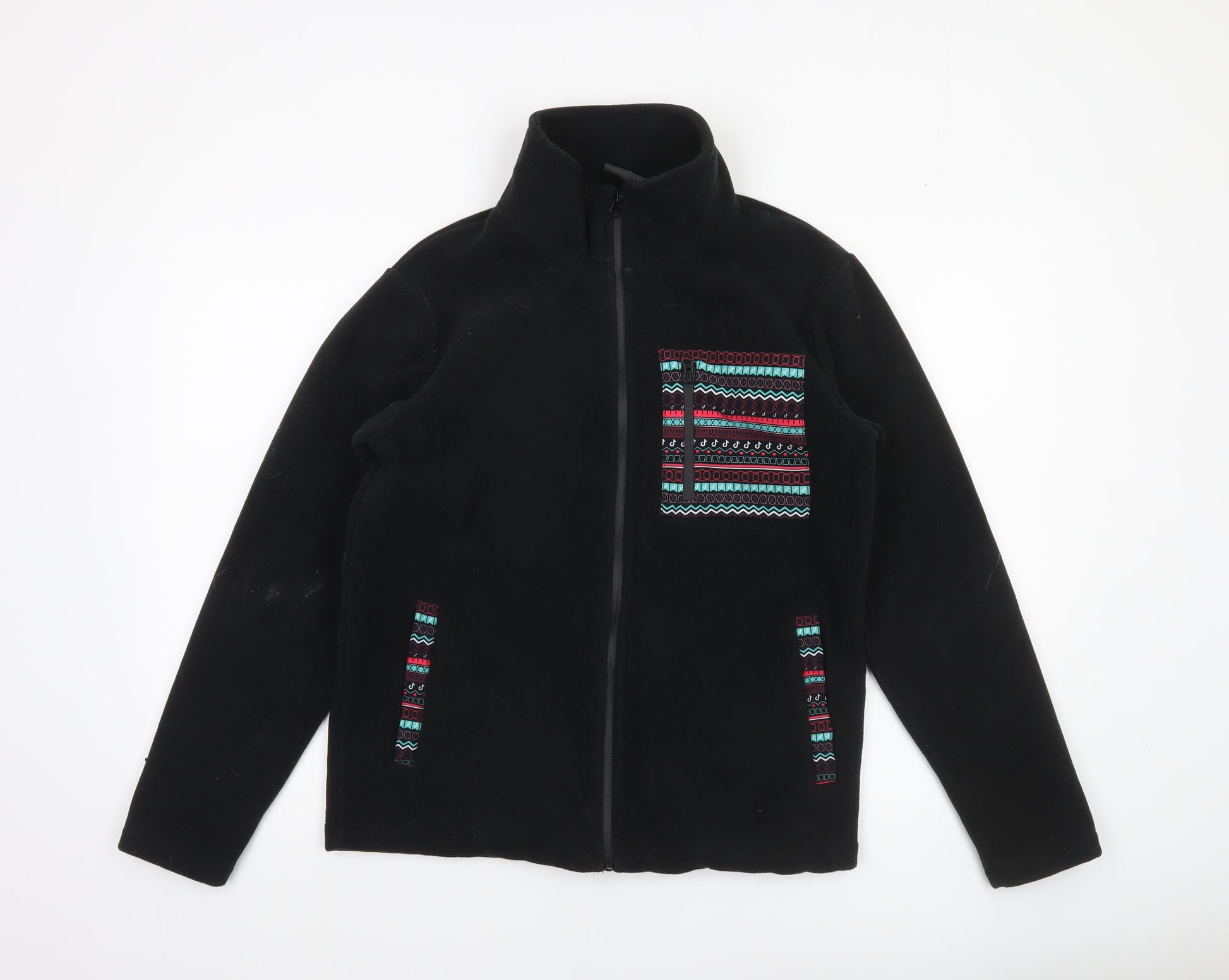 Step into warmth and casual style with this TikTok Men's Black Fleece Jacket. Designed from 100% polyester fleece, this lightweight and comfortable layer is perfect for year-round wear, ideal for cooler days in autumn, winter, and early spring. The jacket’s simple, sleek design features a full front zip closure for ease and practicality, complemented by two front pockets and a striking multicoloured Aztec-inspired embroidered trim on the chest and pocket edges. The soft polar fleece fabric ensures a cosy feel against the skin, while the stand-up collar offers extra neck warmth and wind protection. This regular-fit piece provides both comfort and flexibility, making it suitable for everyday wear, outdoor adventures, or travel. The lightweight construction means you can wear it under a coat for layering or as a standalone jacket in mild weather. With its geometric patterned detailing, this TikTok jacket adds a dash of individuality to your casual wardrobe while maintaining a classic and versatile appearance. Machine washable for easy maintenance, it’s great for those seeking practicality without compromising on style. Whether you’re going for a walk, commuting, or just relaxing, this fleece jacket delivers the perfect combination of warmth, function, and personality. Presented in excellent used condition, this piece shows only light signs of wear such as minor linting typical of fleece materials, but no visible damage or stains. A stylish and easy-to-wear essential, it’s ideal for men who value comfort, utility, and a touch of flair in their outerwear. Available in size small, it offers a flattering regular fit and pairs effortlessly with jeans, joggers, or outdoor trousers for an understated yet trendy finish. Don’t miss out on this unique and reliable mid-layer jacket that’s ready to take you through the seasons in comfort and effortless style.