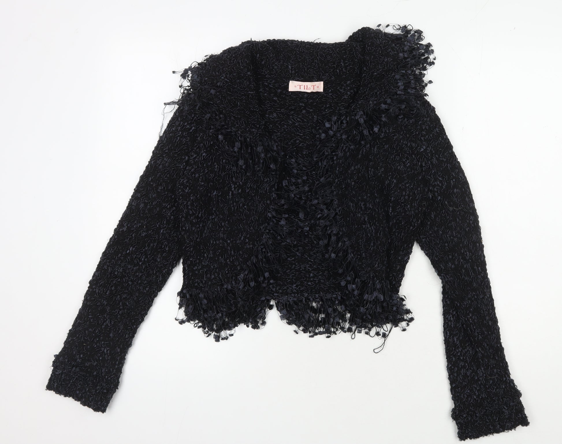 Step into style with this unique Tilt Women's Black Pullover Sweater, designed to combine elegance with a touch of modern fashion. Crafted in a blend of 30% Wool and 70% Acrylic, this jumper promises warmth and softness, perfect for cooler days. Its chunky-knit design gives it an appealing texture, while the fringe accents add an exciting twist, bringing a stylish flair to your ensemble. Ideal for women who appreciate a blend of classic and contemporary, this piece is both versatile and fashionable. Its long sleeves provide coverage and comfort, ensuring you stay cozy while looking chic. Designed in a sleek black colour, this pullover is an effortless match with any outfit. Whether you're pairing it with jeans for a casual outing or dressing it up with a skirt for a night out, its understated elegance makes a statement. Perfect for any season, this sweater can be easily layered to suit changing weather conditions. While currently in excellent condition with no visible wear or damage, you can enjoy this piece as if it's brand new. Priced attractively, it offers fantastic value for those seeking a unique addition to their wardrobe. Upgrade your collection with this stylish Tilt sweater, promising comfort, quality, and style in every wear.