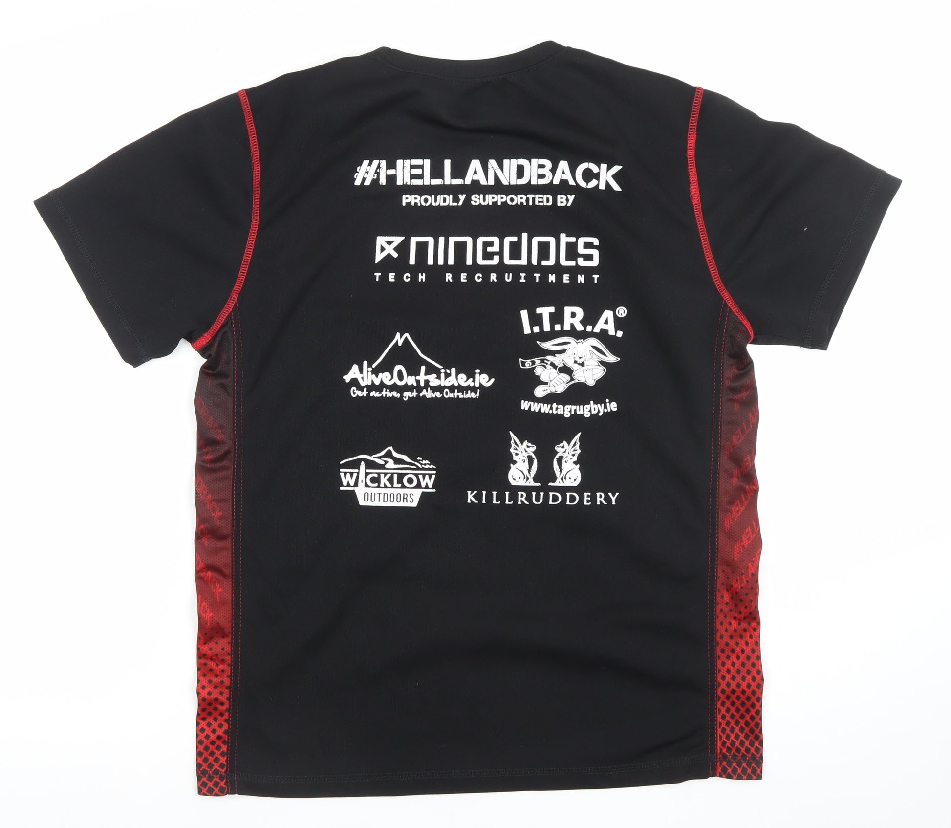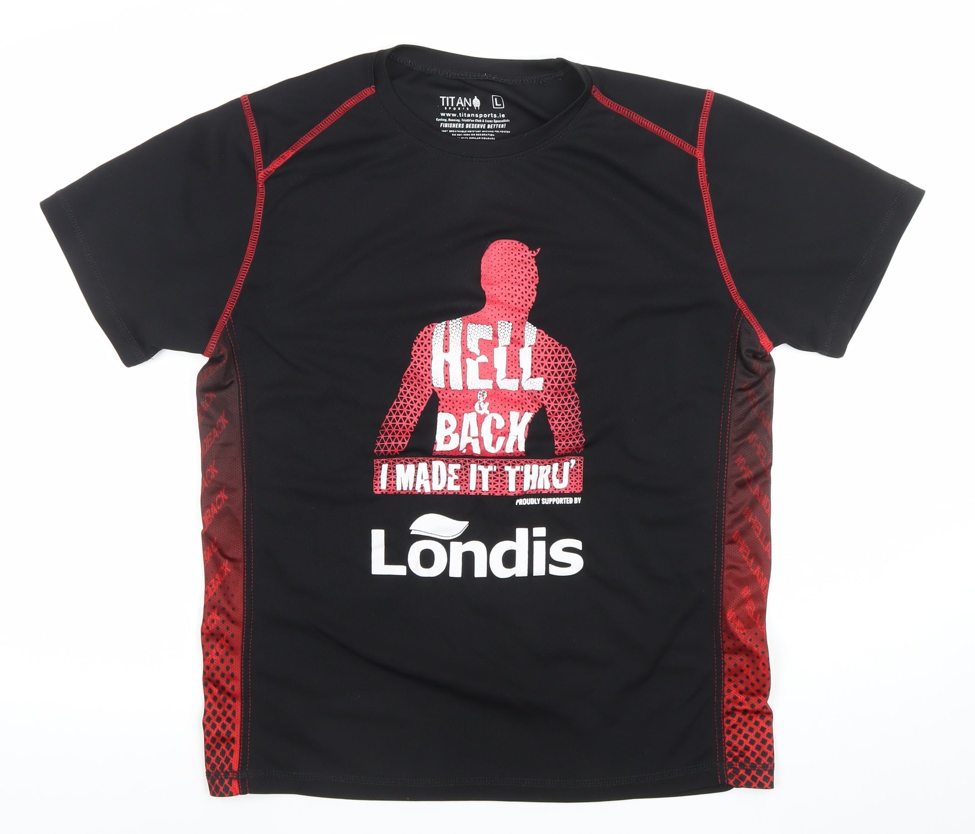 Take on your next challenge with confidence in this Titan Sports men’s black short sleeve running T-shirt. Designed for endurance and comfort, this high-performance top is ideal for running, cycling, triathlon training, and any high-intensity activity. Crafted from 100% breathable moisture-wicking polyester, it works hard to keep you cool and dry, even through the toughest workouts. The fabric is lightweight yet durable, making it an excellent choice for both training days and competitive events. Featuring a bold 'Hell and Back – I Made It Thru' event graphic on the chest and various sponsor logos on the back, this shirt celebrates perseverance and achievement. The athletic fit enhances mobility without feeling restrictive, while the raglan sleeves provide excellent flexibility and comfort around the shoulders. Red side panels and contrast stitching add a striking, sporty accent that stands out from ordinary activewear. This Titan Sports shirt offers functional features like moisture wicking, quick-drying, and breathable technology to enhance performance. It’s ideal for spring, summer, and autumn outdoor training, whether you’re hitting the road, tackling a triathlon, or heading out for a long-distance jog. The pullover style and smooth fabric make it effortlessly easy to wear and care for – simply machine wash to refresh. In excellent pre-owned condition with minimal signs of wear, this quality top delivers great value for experienced and casual athletes alike. A perfect addition to your activewear rotation, it embodies motivation, durability, and comfort in every run. Whether you’re commemorating a 'Hell and Back' achievement or just want an elite-quality T-shirt built for performance, this Titan Sports top is a winner. Stay cool, stay comfortable, and push your limits in style.