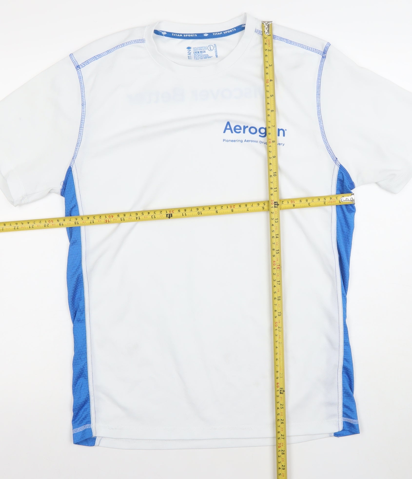 Stay active and comfortable in this Titan Sports men's activewear top, designed for performance and versatility. Crafted from 100% polyester, the shirt provides exceptional breathability and moisture wicking to help keep you cool and dry during workouts, jogging sessions, or gym training. The crisp white colour with blue side panels and contrast stitching adds a modern athletic flair that suits any sports enthusiast. The short sleeve crew neck design ensures unrestricted movement, while the lightweight fabric enhances ease of wear throughout active sessions. Featuring a printed Aerogen logo and a back slogan, it adds a unique branded detail that sets it apart from basic training tops. The regular fit construction ensures a comfortable silhouette suitable for casual wear or high-energy activity. Perfect for summer or spring wear, this T-shirt provides a combination of lightweight flexibility and stylish practicality. Machine washable for easy care, it’s an ideal wardrobe addition for anyone who values both performance and style. This pre-owned item is in very good condition with minor marks near the lower front area, priced reflectively for excellent value. A reliable choice for sports, fitness, or casual use alike, this Titan Sports top blends simplicity, durability, and modern design to deliver quality you can rely on. Whether for gym training, outdoor running, or general activewear, it’s a dependable option offering comfort and durability you can count on. Pair it with your favourite shorts or track pants for an effortless athletic outfit that performs as well as it looks.