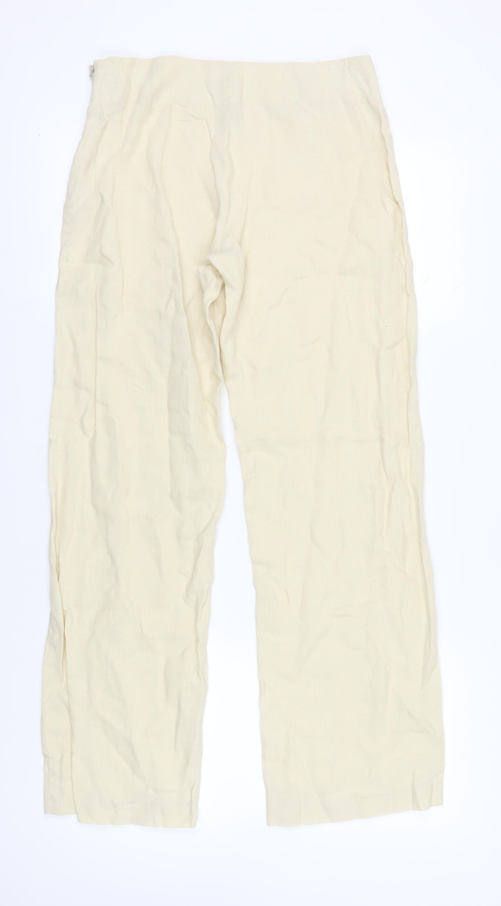 Elevate your wardrobe with these elegant Toast Women's Linen Trousers, perfect for the warmer months of spring and summer. Crafted from 100% linen, these trousers offer a comfortable and breathable fit, making them ideal for casual occasions. The sleek ivory colour adds a touch of sophistication, while the straight leg style ensures a relaxed fit without compromising on chicness.With a mid-rise and a flat front, these trousers provide a flattering silhouette. They are designed for the modern woman who appreciates both style and comfort. The zip closure adds a streamlined finish, ensuring easy wearability. Though used, they remain in excellent condition with only slight creasing, which adds to their relaxed charm.Pair these trousers with a tailored blouse or a casual tee for a versatile look that transitions from day to night effortlessly. Their linen construction not only enhances their aesthetic appeal but also assures durability and ease of care, being machine washable.Whether you're heading out for a casual lunch or a relaxed evening walk, these ivory linen trousers are a must-have addition to your collection. Experience the subtle elegance and comfort with Toast's reputed quality that promises longevity and timeless style. Perfect for those who value simple, understated elegance and function.