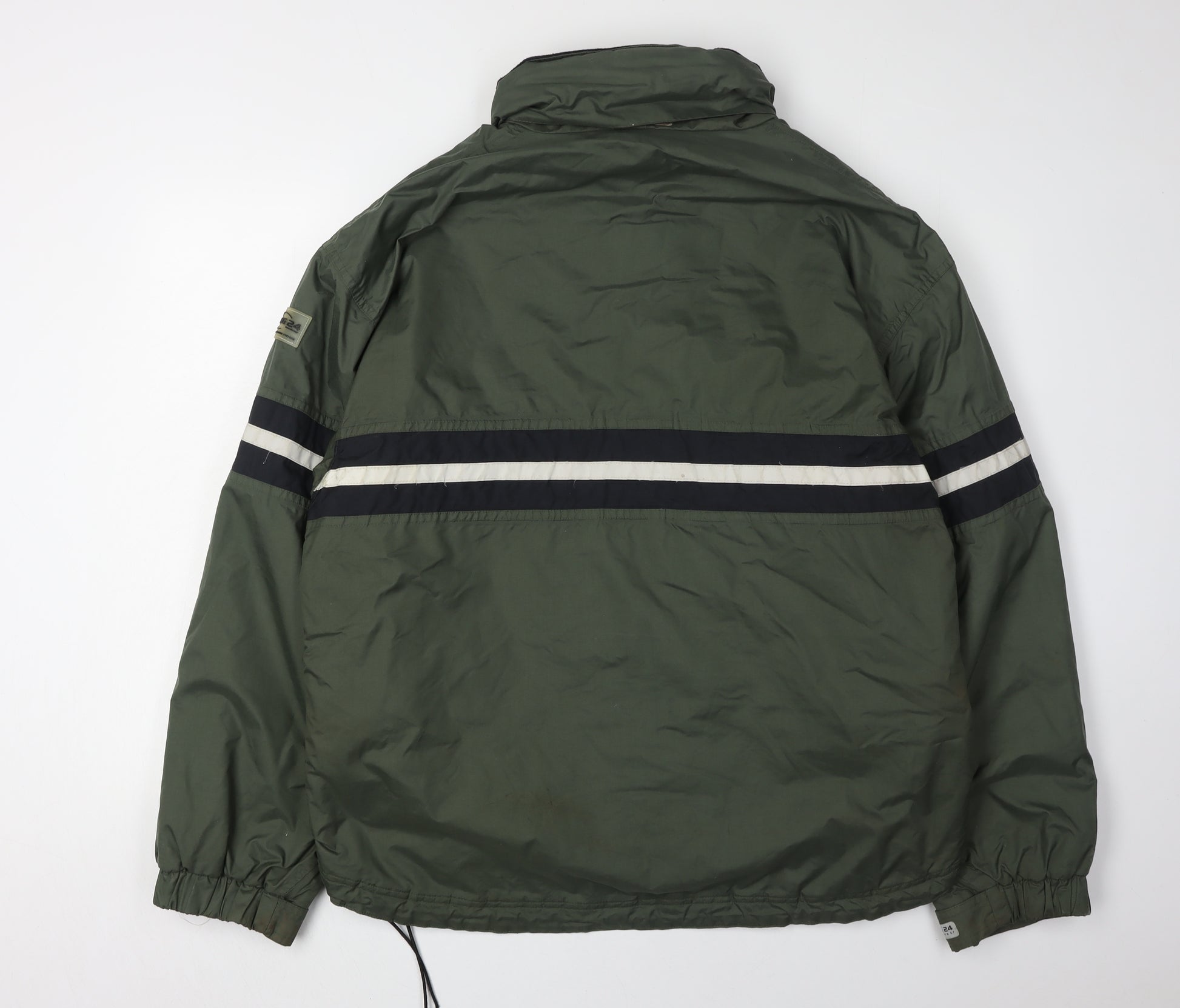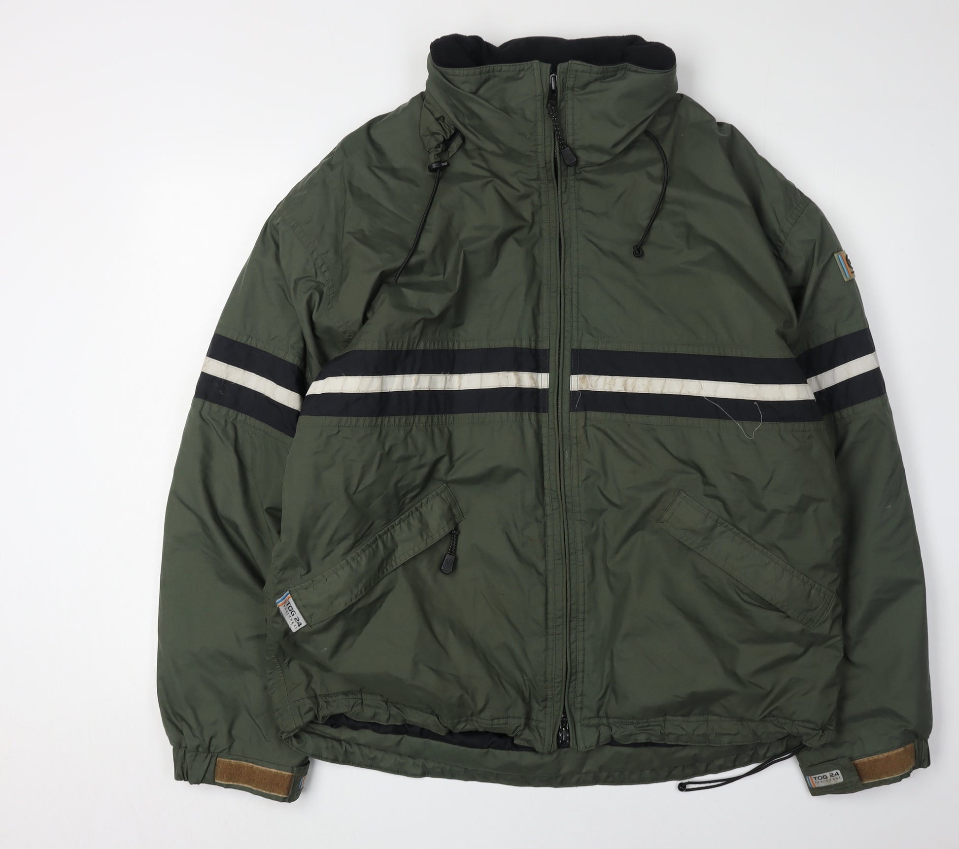 Stay warm and comfortable with the TOG 24 Men's Green Puffer Jacket, perfect for casual outings and winter sports. Crafted with a durable blend of nylon and polyester, this hooded jacket features a full zip closure with convenient pockets for practicality. The mid-length cut and regular fit ensure a snug, comfortable wear, while the jacket's stand-up collar provides additional warmth. Ideal for skiing and other outdoor winter activities, this jacket remains machine washable for easy care. Despite some slight stains on the stripes, this jacket remains in good condition, bringing functionality and style to your cold-weather wardrobe.