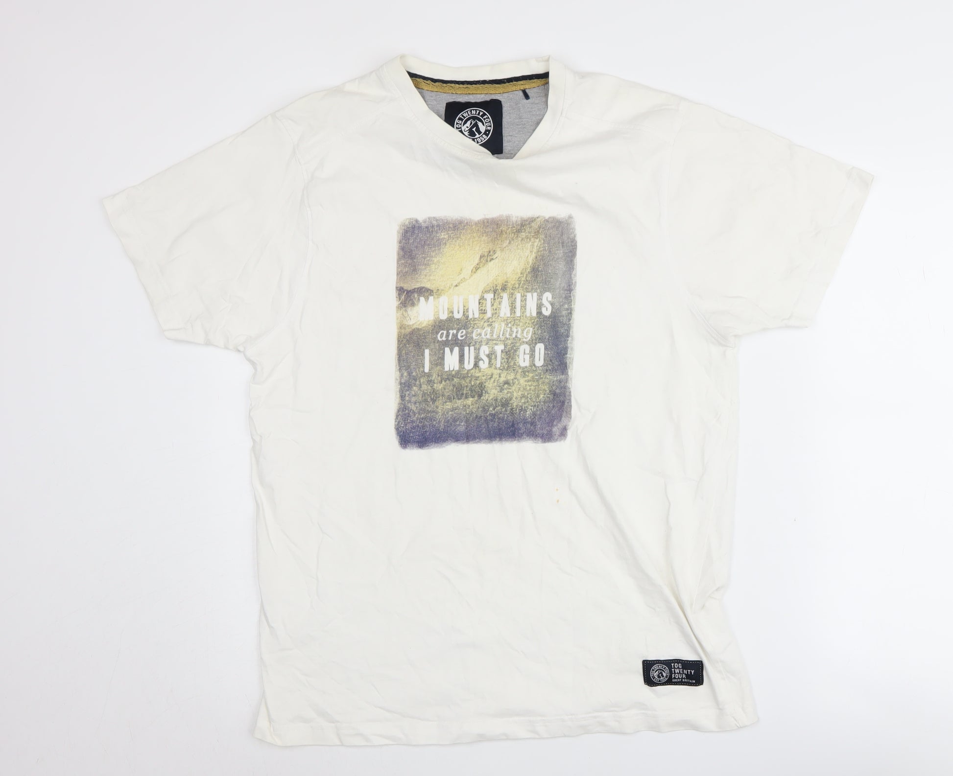 Discover rugged style with this Tog Twenty Four Men's T-Shirt, perfect for those who hear the call of the mountains. Crafted for comfort, it features a bold nature-themed graphic print that reads 'Mountains are calling, I must go,' making it an ideal pick for outdoor enthusiasts. The short sleeve, crew neck design offers a classic fit that's versatile for year-round wear. Made from 100% cotton jersey fabric, it promises breathability and easy care with machine washability. Slight stains add a subtle rustic charm. The white background enhances the striking logo accent, making it a must-have for any adventurer's wardrobe. Embrace the outdoors in style and comfort with this nature-inspired tee.