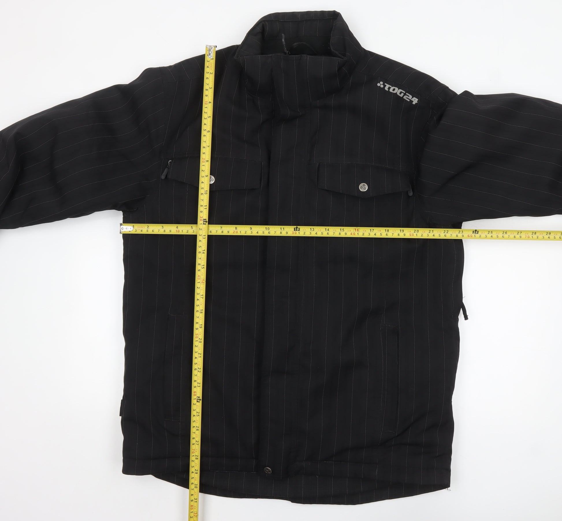 Step out in style and comfort with this TOG24 men’s black pinstripe jacket, designed for those who appreciate practical outerwear with refined, understated style. Crafted from a durable blend of 80% polyester and 20% viscose, the jacket offers a sleek pinstripe finish that easily transitions from urban outings to countryside walks. Its regular fit ensures a comfortable structure while allowing for easy layering through the cooler months. Featuring a stand-up collar and both zip and button closures, it provides versatile protection against chilly winds. Thoughtfully detailed with front zip and button pockets, this jacket is ideal for keeping your essentials secure, whether you’re commuting, travelling, or enjoying casual weekends outdoors. The full lining ensures extra warmth for autumn and winter wear, while the TOG24 branding subtly accents the shoulder and rear hem for a distinctive touch. The mid-length cut creates a flattering profile that complements smart-casual and everyday looks alike. Machine washable for convenience, this jacket is built for long-lasting use. In excellent condition with minimal signs of wear, it’s a dependable addition to your outerwear rotation—perfect for those who value functionality without sacrificing timeless appeal. Experience the dependable British outdoor craftsmanship of TOG24, combining quality materials, comfort, and reliability in one essential piece for your wardrobe.