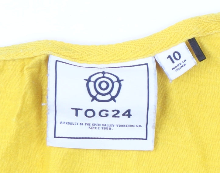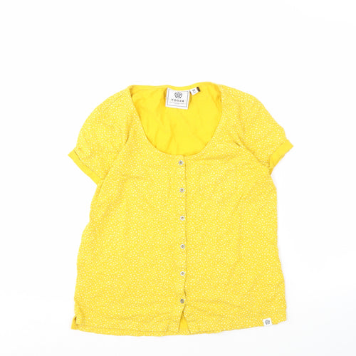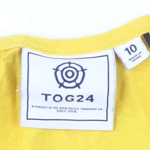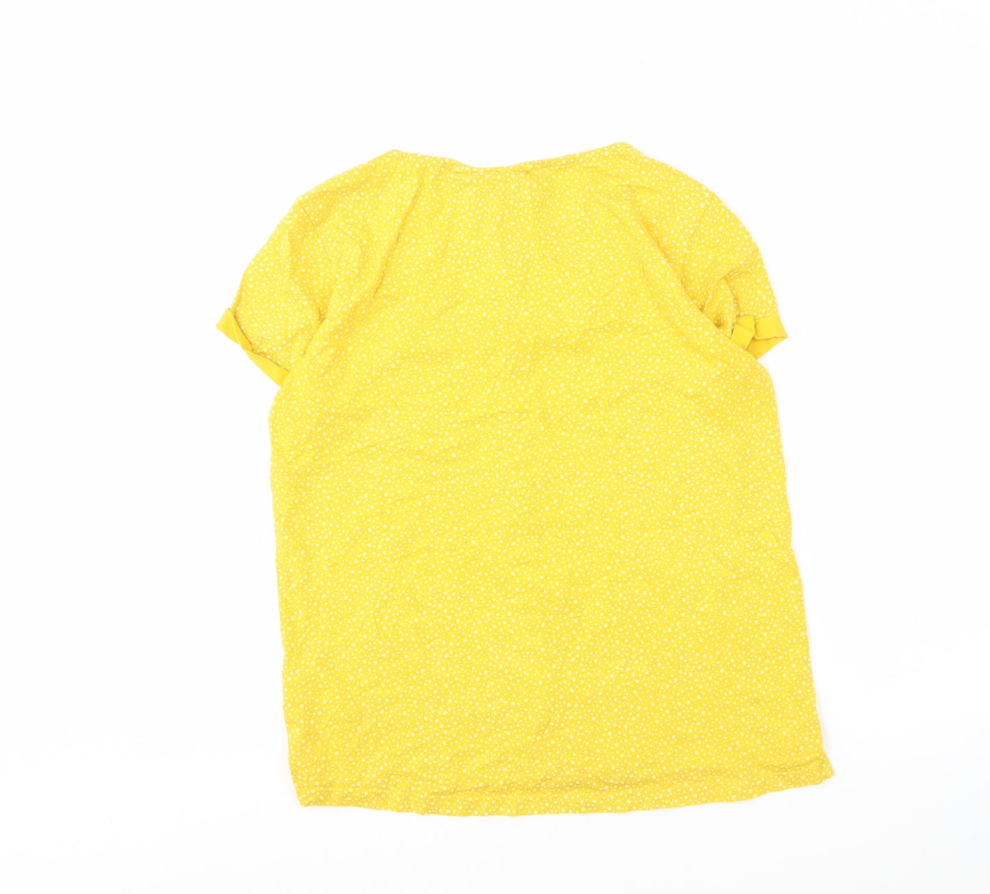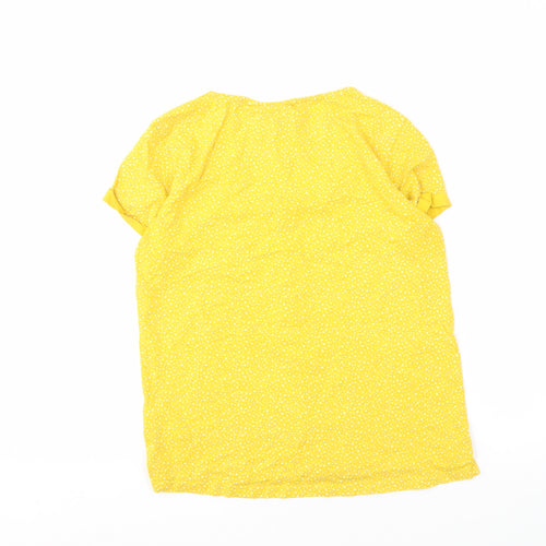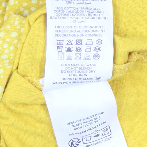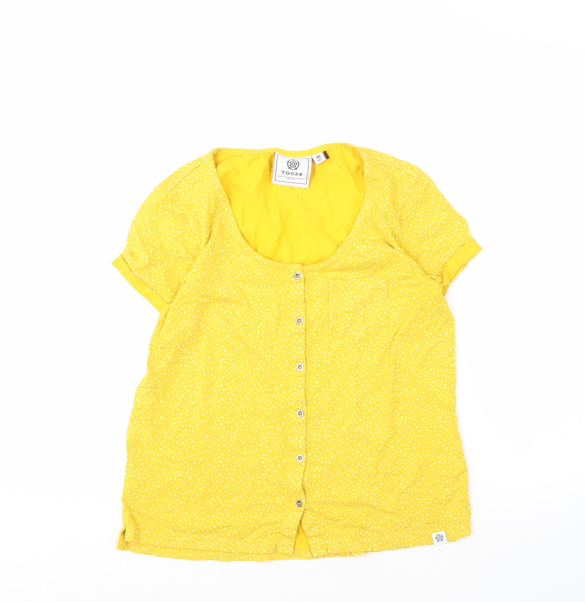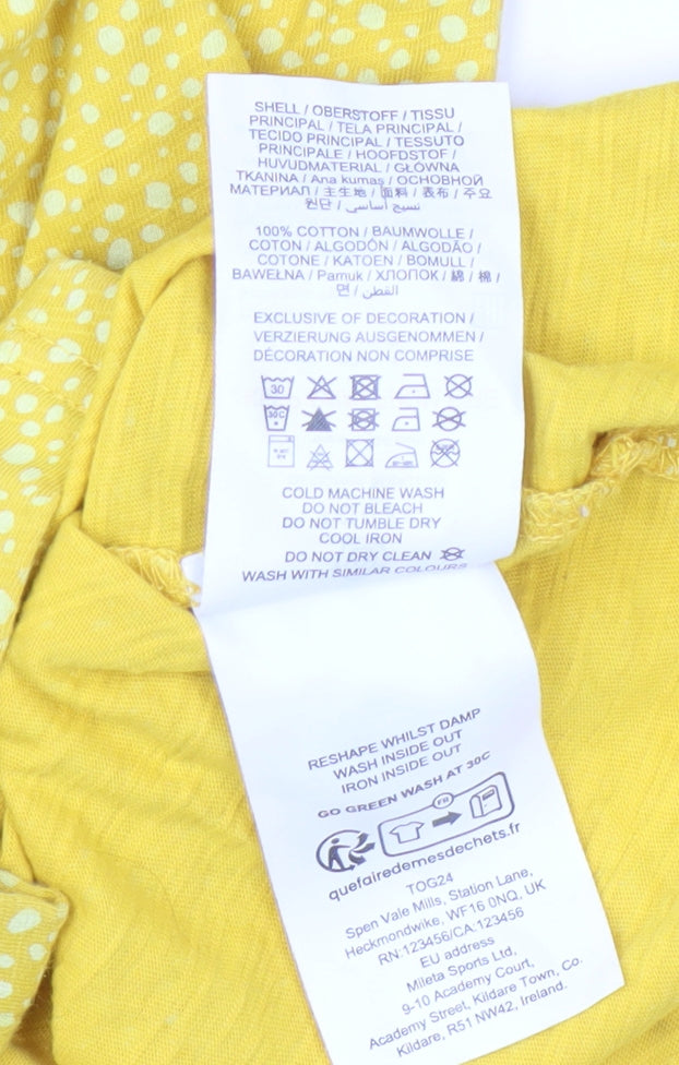 Introduce a splash of colour to your wardrobe with this delightful TOG24 Women's Yellow Polka Dot Button-Up Shirt. Perfectly suited for a sunny spring or summer day, this shirt is crafted from 100% cotton, ensuring both comfort and breathability. Its soft, scoop neck complements a casually feminine style, while the short sleeves and fitted design make it an ideal choice for an array of casual occasions. The cheerful yellow adorned with playful polka dots brings a lively energy to any ensemble, setting a joyful tone for your outings. Featuring a neat button-up closure, this piece not only offers style but also convenience, allowing for easy wear. Whether you're heading to a casual lunch or a day out in the park, this shirt makes a versatile addition to your collection. The very good condition speaks to its quality, promising a charming addition to your wardrobe at a great value. Pair it with your favourite jeans or a flowy skirt and embrace the delightful combination of fashion and comfort. Machine washable for easy care, this shirt is a practical yet stylish choice for the contemporary woman. Don't miss the chance to own this elegant garment that promises to elevate your everyday style.