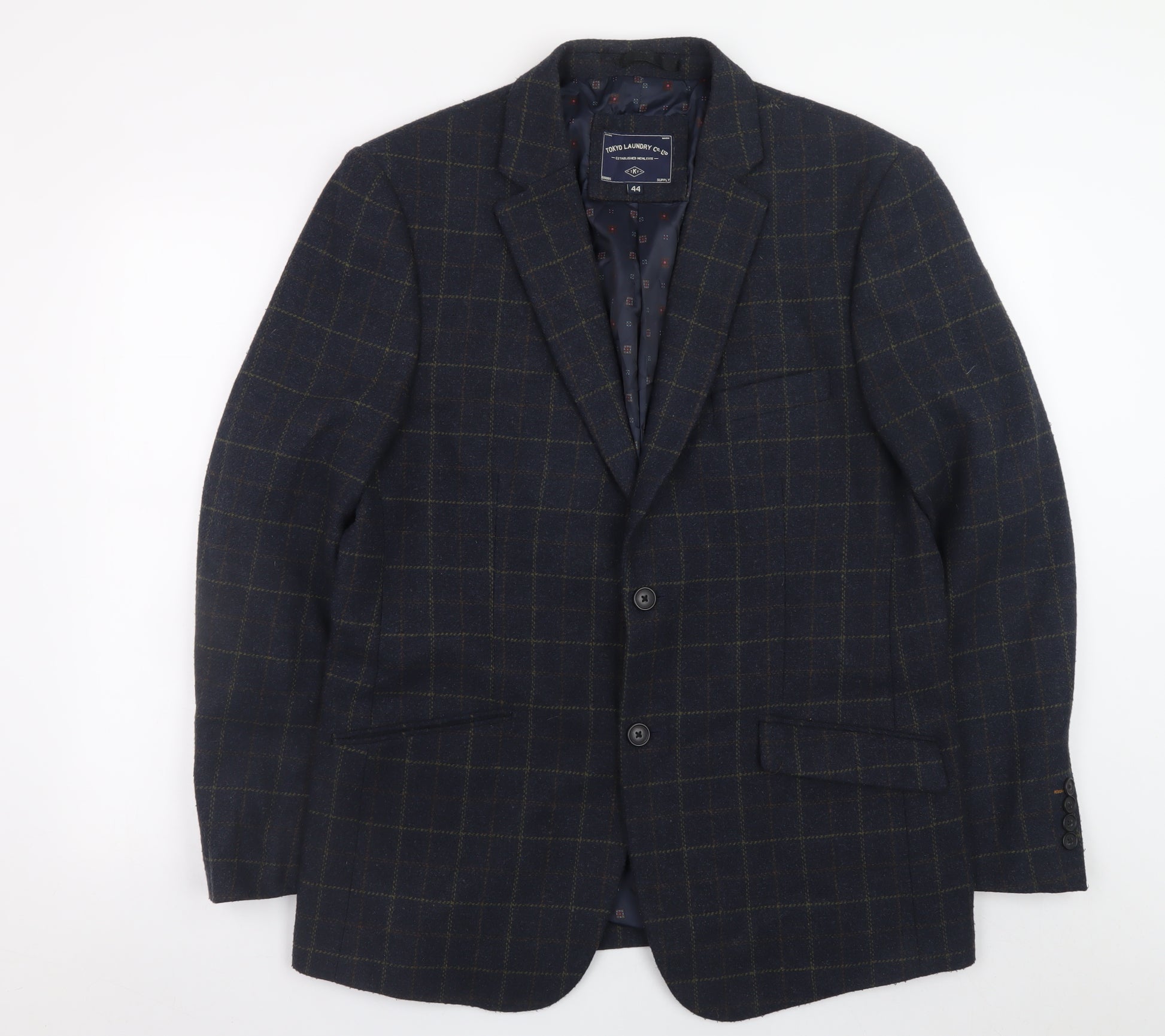 This Tokyo Laundry men's blazer combines timeless sophistication with contemporary style, perfect for any season. Crafted in a classic blue check tweed pattern, the blazer offers effortless sophistication for business, formal, or smart casual occasions. Expertly tailored in a regular fit, it provides a comfortable silhouette with a flattering shape suitable for both office wear and evening outings. Constructed from a premium wool blend fabric (75% polyester, 11% wool, 5% viscose, 4% cotton, 4% acrylic, 1% polyamide), it delivers a superb balance of durability and warmth with a soft handfeel. The mid-length design and notched collar add to its refined aesthetic, while full lining ensures added comfort and structure. This two-button, single-breasted blazer features side flap pockets and an interior pocket for practicality without compromising on design detail. The jacket’s check pattern lends a traditional English charm, making it versatile enough to complement both formal trousers and smart denim. Subtle features such as button cuffs and inner lining details add to its premium quality look. Ideal for autumn and winter wear, it’s a reliable choice when the occasion demands a polished yet relaxed outfit. This piece is in very good pre-owned condition overall, with only light signs of wear visible on the back panel, ensuring plenty of life left in this stylish garment. Whether you’re dressing for a meeting, date night, or casual dinner, this Tokyo Laundry wool blend blazer will elevate your outfit effortlessly while maintaining comfort and classic appeal. A dependable addition to any modern man’s wardrobe, it’s the perfect blend of smart design and everyday style versatility.