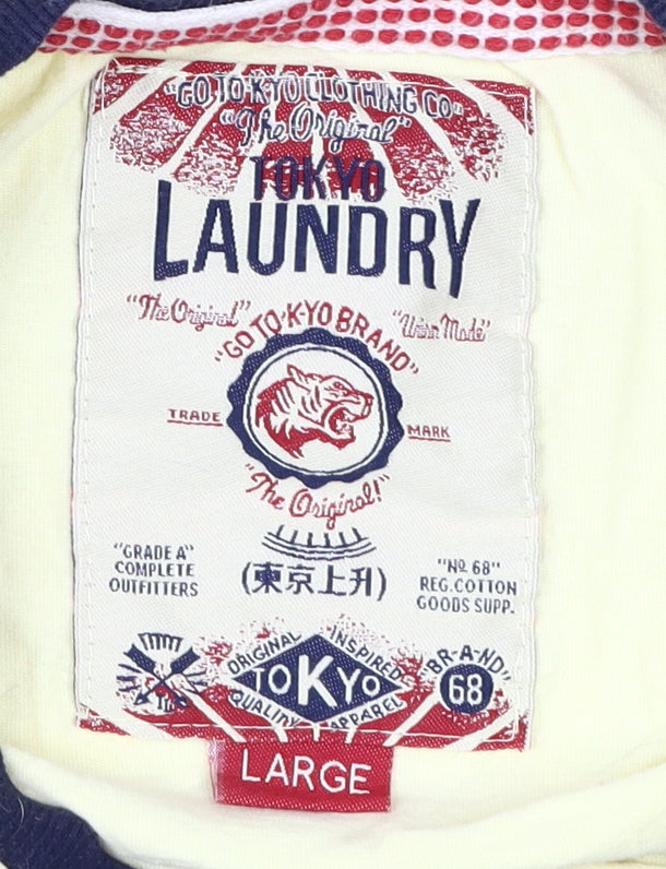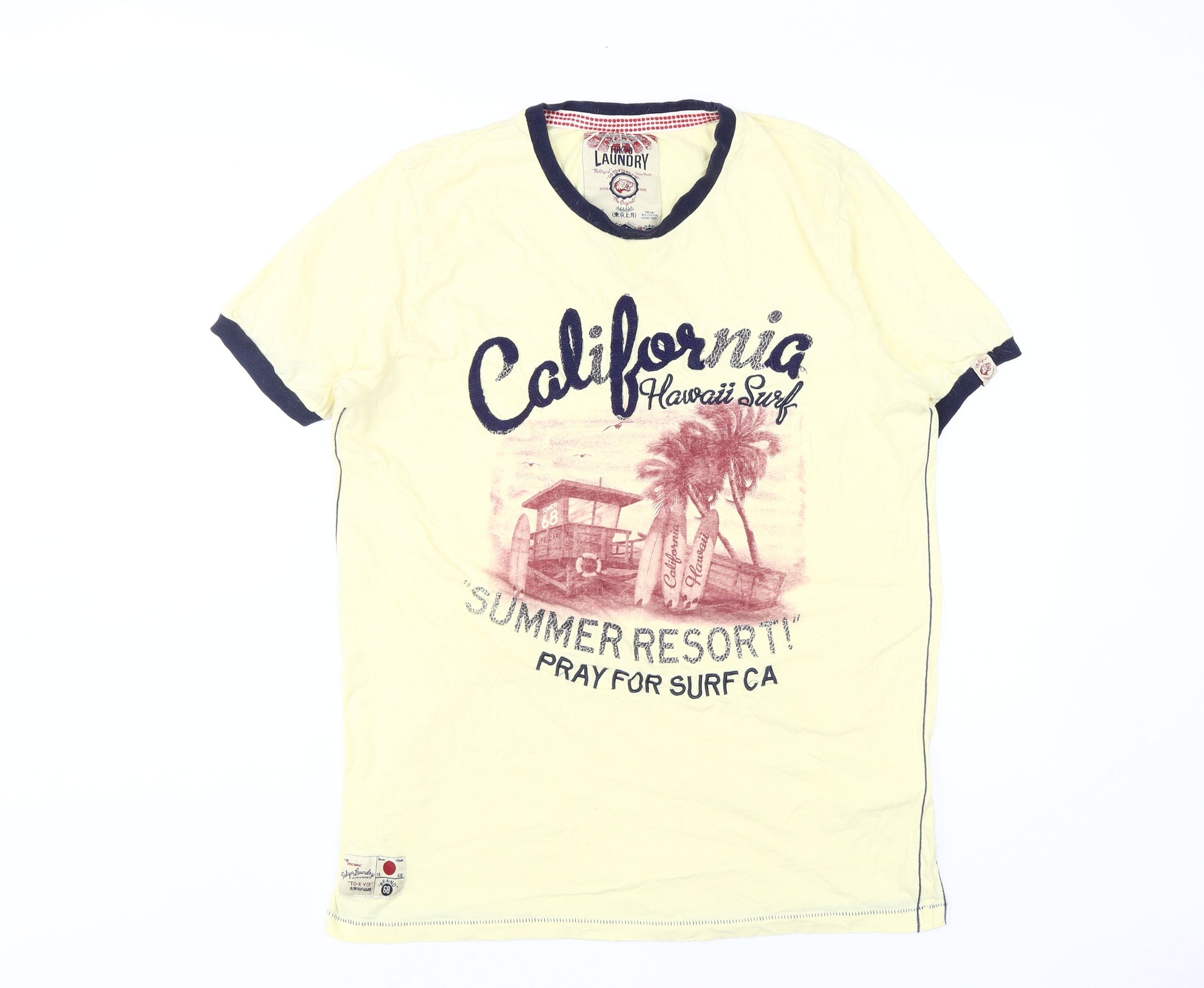 Embrace the summer vibe with this Tokyo Laundry Men's Yellow Graphic Print T-Shirt in size large. Featuring a vibrant surf-inspired design, it's perfect for casual outings and beach adventures. Made from 100% cotton, this T-shirt ensures comfort and breathability, ideal for warm summer days. The regular fit and short sleeves offer a relaxed look, while the V-neckline adds a stylish touch. Accented with embroidery and a logo, it showcases attention to detail and quality craftsmanship. Despite some slight fading, the shirt is clean and in very good condition, ready for a new owner. Machine washable for easy care, it's a practical addition to any wardrobe. Whether you're hitting the beach or hanging out with friends, this T-shirt will keep your style on point. Don't miss the opportunity to make it yours at an attractive price.