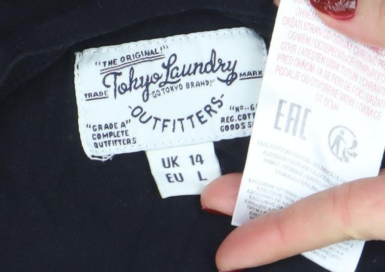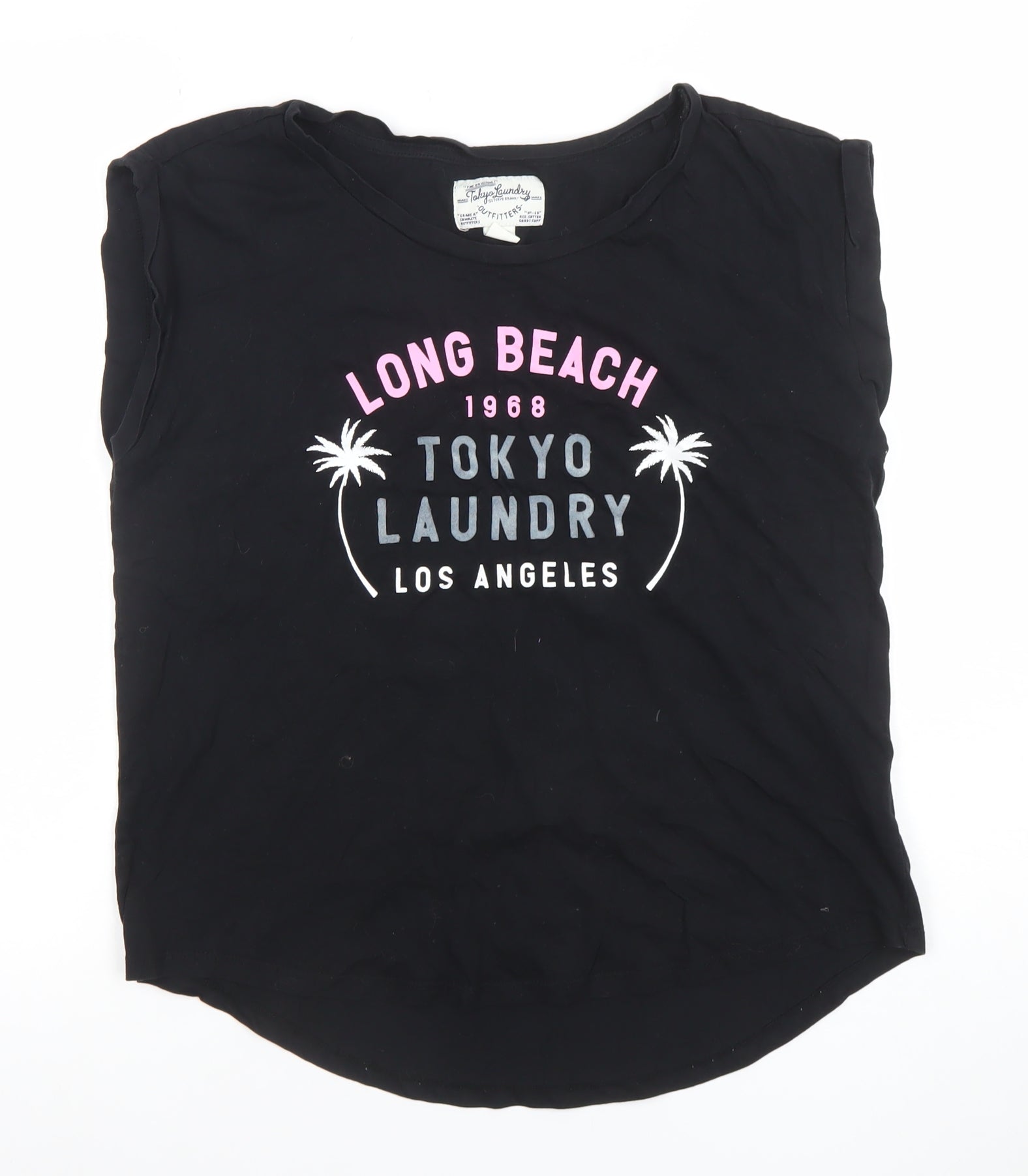 Refresh your casual wardrobe with this stylish black Tokyo Laundry women's T-shirt. Crafted from 100% cotton, this lightweight and breathable top ensures lasting comfort through warm days, making it ideal for spring and summer wear. The classic sleeveless cut and crew neckline give it a timeless, easy-to-wear shape that flatters while allowing effortless movement. Designed in a soft jersey fabric, it offers a relaxed fit perfect for laid-back everyday styling. The front features an eye-catching printed ‘Long Beach 1968 Tokyo Laundry Los Angeles’ motif with palm detail, adding a chic urban touch inspired by California’s iconic coastal vibe. Its versatile black shade makes it a perfect pairing piece for jeans, shorts, or skirts, whether you’re heading out for a relaxed day, a casual meet-up, or simply enjoying your weekend comfort. Tokyo Laundry’s quality craftsmanship gives this top durability while retaining softness wash after wash. The breathable cotton construction makes it an ideal staple for layering or wearing solo when the temperature rises. Its subtle rounded hemline adds gentle shape to the silhouette. This gently used garment is in very good condition with minimal signs of wear and only light natural creasing visible. It’s machine washable for easy care, offering practicality alongside fashion appeal. If you’re searching for a go-to essential that combines comfort, style, and timeless streetwear spirit, this Tokyo Laundry T-shirt is a perfect addition to your wardrobe. Whether it’s worn out and about, for travel, or for everyday casual use, it offers that easy charm and premium cotton quality you’d expect from the brand. Treat yourself to an effortlessly versatile top that works season after season.