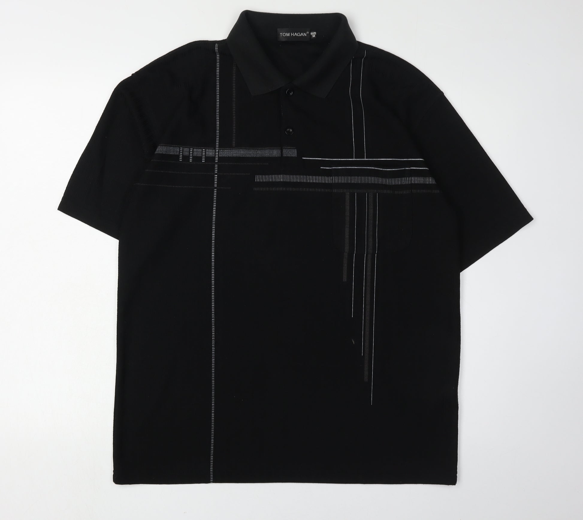 Elevate your casual wardrobe with this stylish Men's Tom Hagan Polo in a classic black colour. Crafted for a seamless blend of comfort and modern style, this polo shirt features a graphic print that adds a touch of sophistication. Made from a high-quality cotton and polyester blend, it promises both durability and breathability, ensuring you stay comfortable throughout the day. The short sleeve design and point collared neckline make it ideal for any casual occasion, while the button closure adds a touch of classic charm. Whether you're heading out for a casual outing or just lounging indoors, this polo is your perfect versatile choice. The machine washable fabric makes it easy to care for, ensuring it remains a staple in your wardrobe for seasons to come. Don't miss out on adding this excellent-condition piece to your collection, promising style and comfort without compromise.