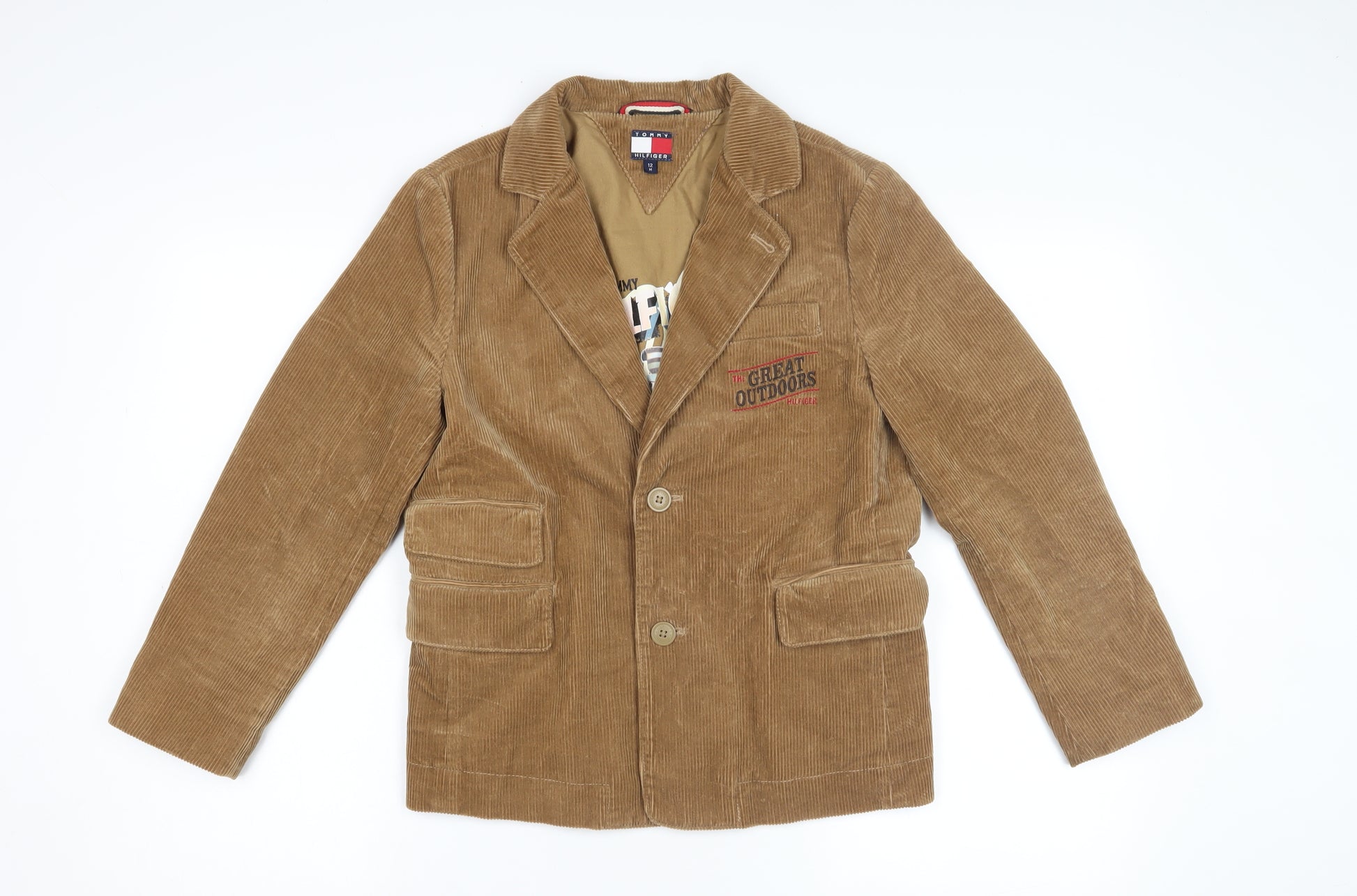 Enhance your wardrobe with this classic Tommy Hilfiger blazer, perfect for a versatile and sophisticated look. Crafted from a rich brown corduroy, this blazer is designed for both men and women. With a regular fit and a mid-length cut, it ensures comfort and style for everyday wear. Featuring a button closure and a timeless no-pattern design, this piece is ideal for casual occasions or a smart-casual office environment. Subtle button accents and a lined interior add to the refined look. Made primarily from comfortable cotton, complemented by polyamide and elastane, it's a durable choice for the autumn season. Slight wear is visible on the back, but overall in excellent condition. Priced attractively, this blazer is a must-have for fashion-forward individuals seeking quality and elegance.