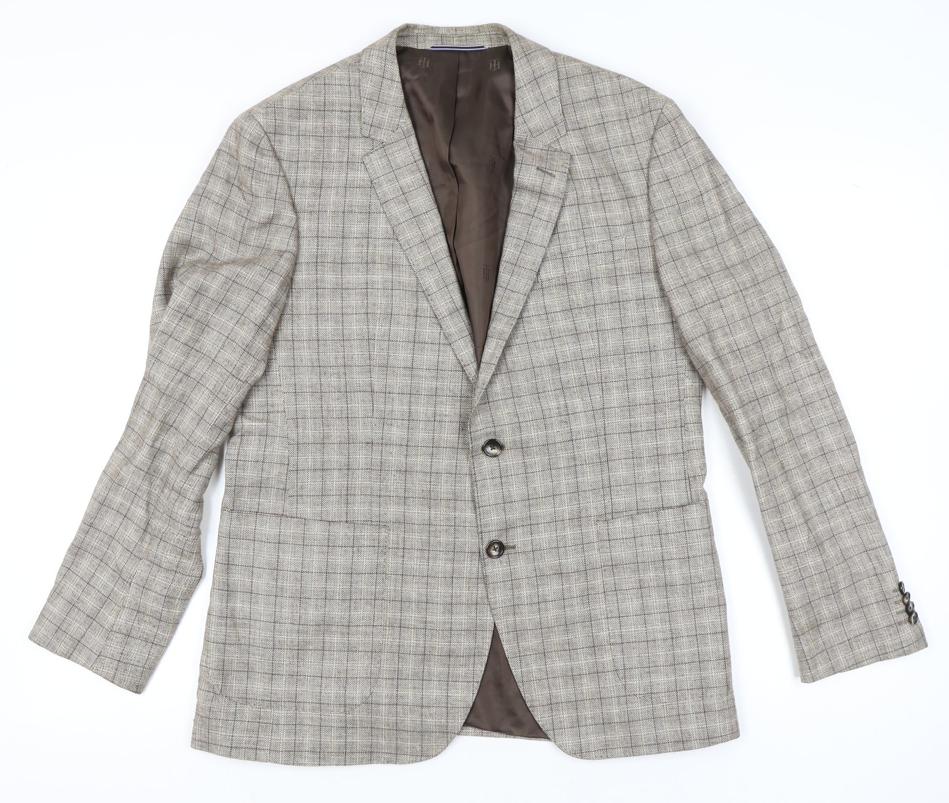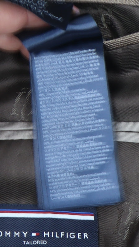 Elevate your wardrobe with this refined Tommy Hilfiger tailored blazer, designed for the modern gentleman who values timeless elegance with a contemporary edge. Crafted from a premium blend of 54% polyester, 44% wool and 2% linen, this jacket offers both comfort and durability while maintaining its structure throughout wear. The beige check pattern provides a sophisticated yet versatile aesthetic, making it a standout piece that complements a range of outfits. Cut in a regular fit for all-day comfort, this single-breasted blazer features a classic notch lapel and a stylish two-button front fastening. The tailored silhouette ensures a polished appearance whether you are heading to a business meeting, a special wedding or a formal event. The jacket is fully lined in a soft viscose blend, offering a smooth feel against the skin, while the double-vented back adds ease of movement and flexibility. Additional detailing includes four-button cuffs, structured shoulders, and discreet inner pockets for practicality without compromising style. Ideal for spring, summer or autumn wear, the lightweight fabric blend gives breathability while maintaining a smart look, making it perfect for year-round occasions. Pair this Tommy Hilfiger blazer with formal trousers for a sleek office ensemble, or dress it down with chinos for a more relaxed yet sophisticated approach to weekend style. With its timeless check pattern and premium material mix, it is an investment piece that effortlessly balances modern fashion with classic tailoring. This blazer is offered in excellent condition with only light signs of previous wear, ensuring it has plenty of life left to give. A superb addition to any discerning man’s wardrobe, this Tommy Hilfiger tailored jacket promises lasting value, comfort, and style.