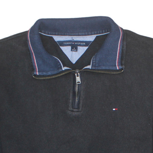 This Tommy Hilfiger men’s black 1/2 zip sweatshirt offers timeless style and superior comfort, perfect for cooler weather and transitional seasons. Crafted from a heavyweight cotton and elastane knit fabric, it combines softness with just the right amount of stretch, ensuring a comfortable and flattering fit for regular wear. The half zip closure and ribbed stand collar with inner contrast detail add a sporty yet refined look, while the small embroidered Tommy Hilfiger flag logo on the chest gives a subtle signature touch. Designed with long sleeves, ribbed cuffs and waistband, this sweatshirt provides warmth without compromising freedom of movement, making it ideal for layering over shirts or tees. The durable cotton blend fabric ensures easy care and longevity, while the classic fit suits a wide range of everyday activities. Perfect for casual outings, weekend wear, or relaxed evening looks, this pullover seamlessly combines functionality and fashion. Best suited for autumn and winter, it pairs easily with jeans or chinos for an effortlessly stylish ensemble. In excellent pre-loved condition with minimal signs of wear, this sweatshirt has been well maintained and shows no noticeable marks or damage. Machine washable for convenience, it retains its colour and structure. A versatile and staple addition to any wardrobe, this Tommy Hilfiger black 1/2 zip sweatshirt brings premium quality and understated elegance that the brand is famous for. Comfortable, durable, and effortlessly stylish, it's a must-have for those who appreciate classic American design with a modern twist.
