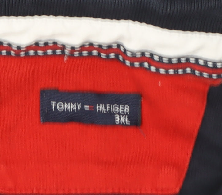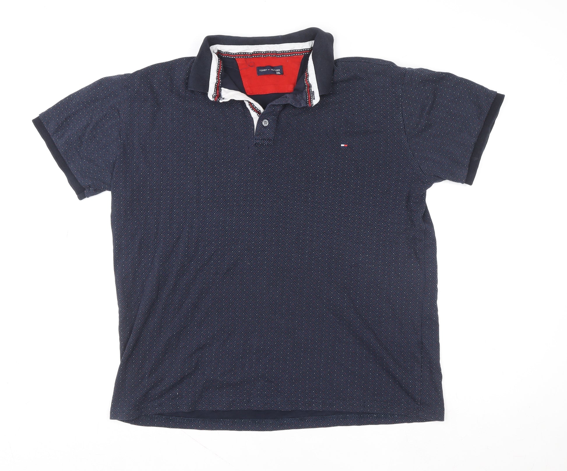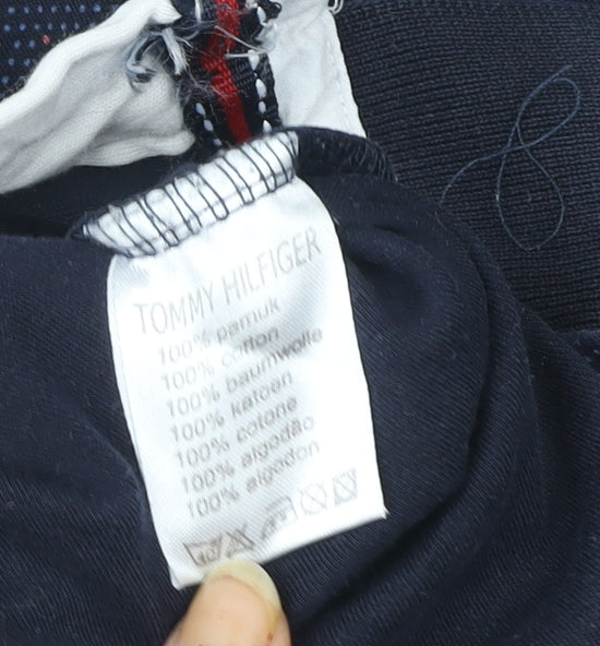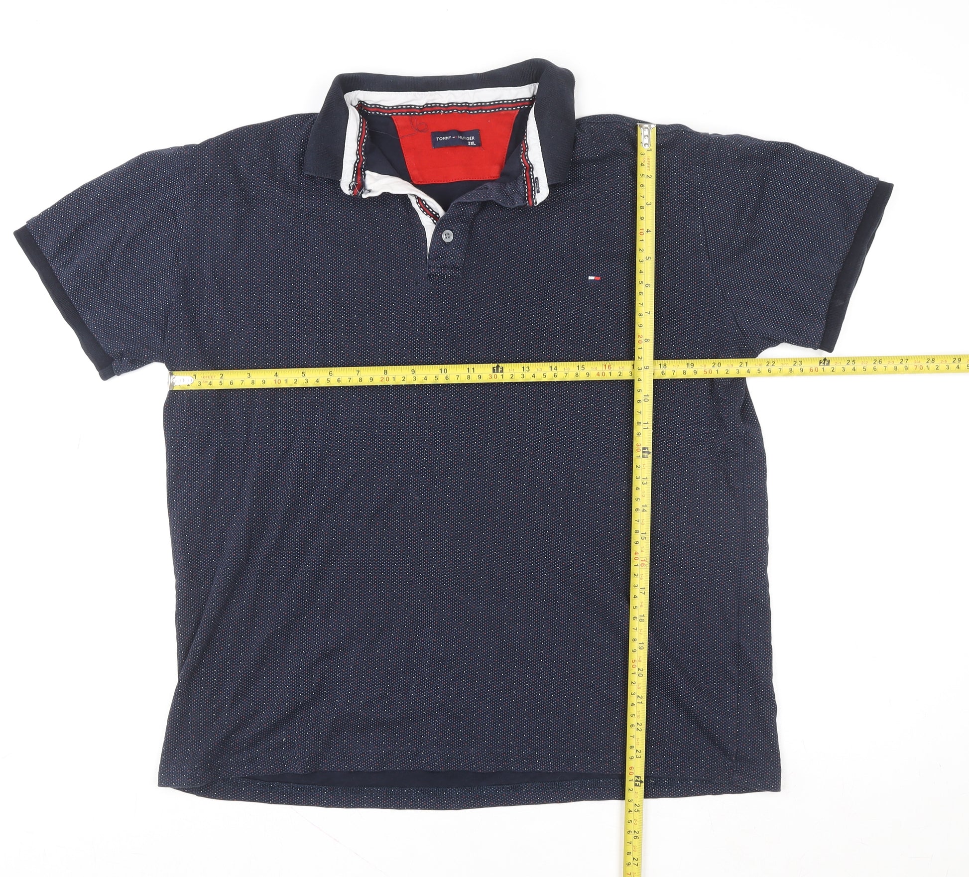This Tommy Hilfiger men’s cotton polo shirt delivers classic design and premium comfort for everyday wear. Crafted entirely from 100% soft cotton, it ensures breathability and lasting shape retention whether you’re out on the golf course, heading to brunch, or styling it for a smart-casual look. The shirt comes in a deep navy-blue tone, subtly patterned with a fine geometric texture that adds understated sophistication while maintaining that iconic Hilfiger casual elegance. Featuring a polo-style button-down collared neckline accented with contrasting trim and interior red detailing, it embodies a timeless yet distinctive brand aesthetic.The embroidered Tommy Hilfiger flag logo sits neatly on the chest, reinforcing its authenticity and premium quality craftsmanship. Designed with a regular fit for ease of movement, this 3XL polo shirt provides a comfortable drape and flattering silhouette for larger builds. The short sleeves and breathable knit fabric make it ideal for warmer seasons such as spring and summer, and it transitions perfectly into autumn when layered beneath lightweight jackets or blazers. The collar and placket add structure and polish, making it an excellent alternative to a standard t-shirt for men who value both style and practicality.This pre-owned piece remains in very good condition, showing only light signs of gentle wear but maintaining its vibrant colour, softness, and shape. It’s machine washable for easy care and durability. Whether you’re dressing it up with chinos or keeping it casual with jeans, this versatile polo embodies the effortless sophistication that defines the Tommy Hilfiger brand. A wardrobe essential for anyone looking to blend premium quality, classic design, and year-round wearability at excellent value.