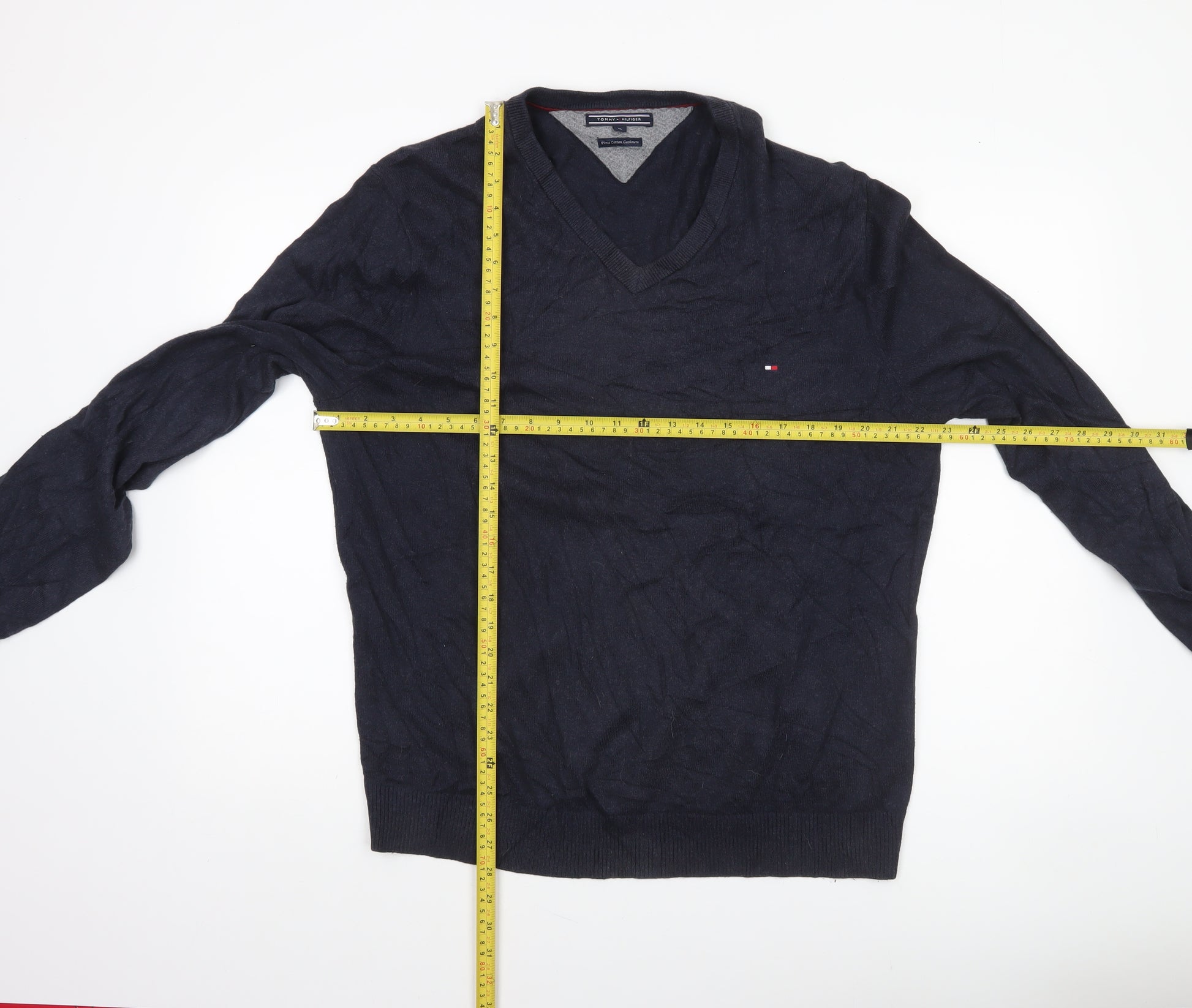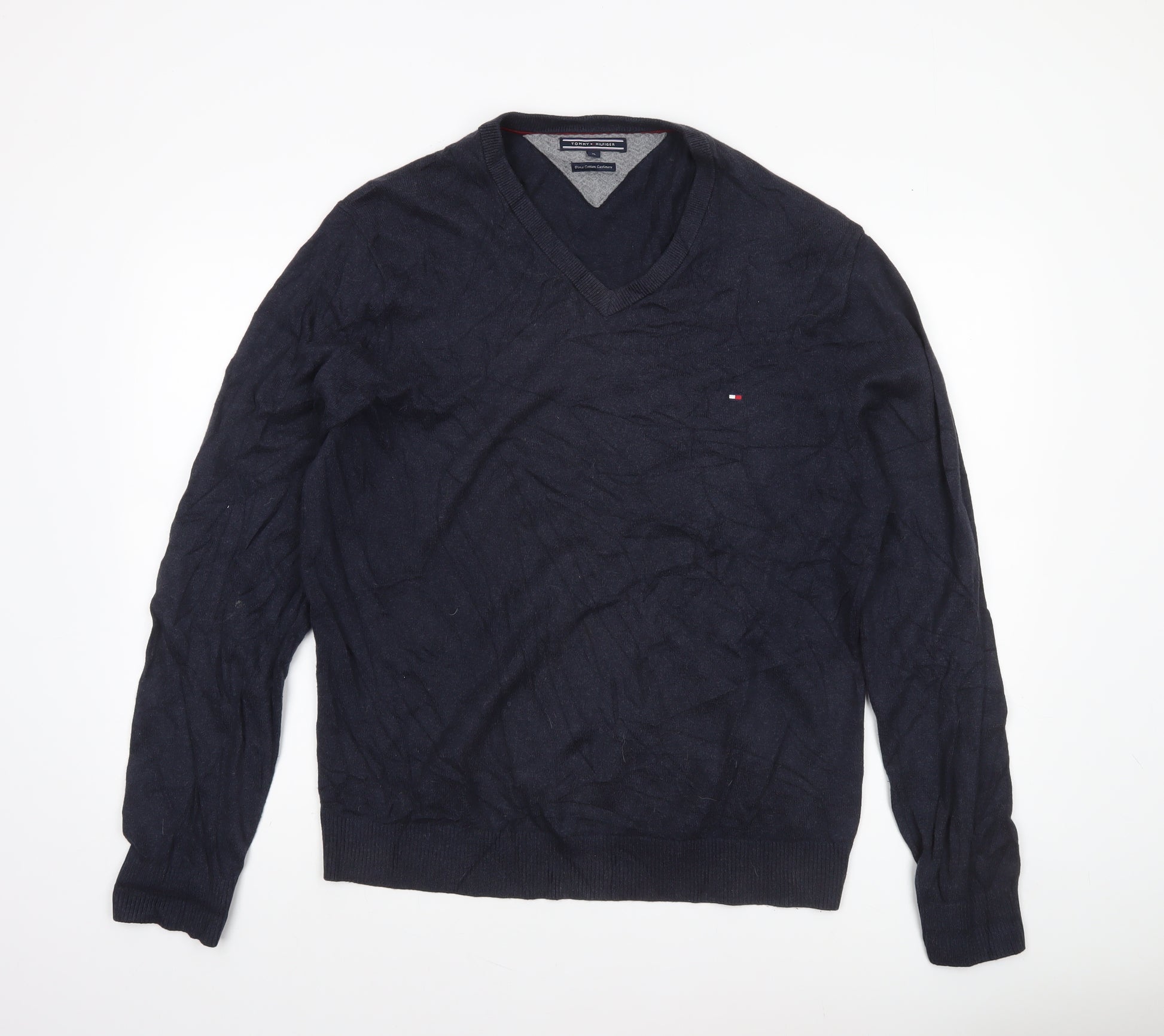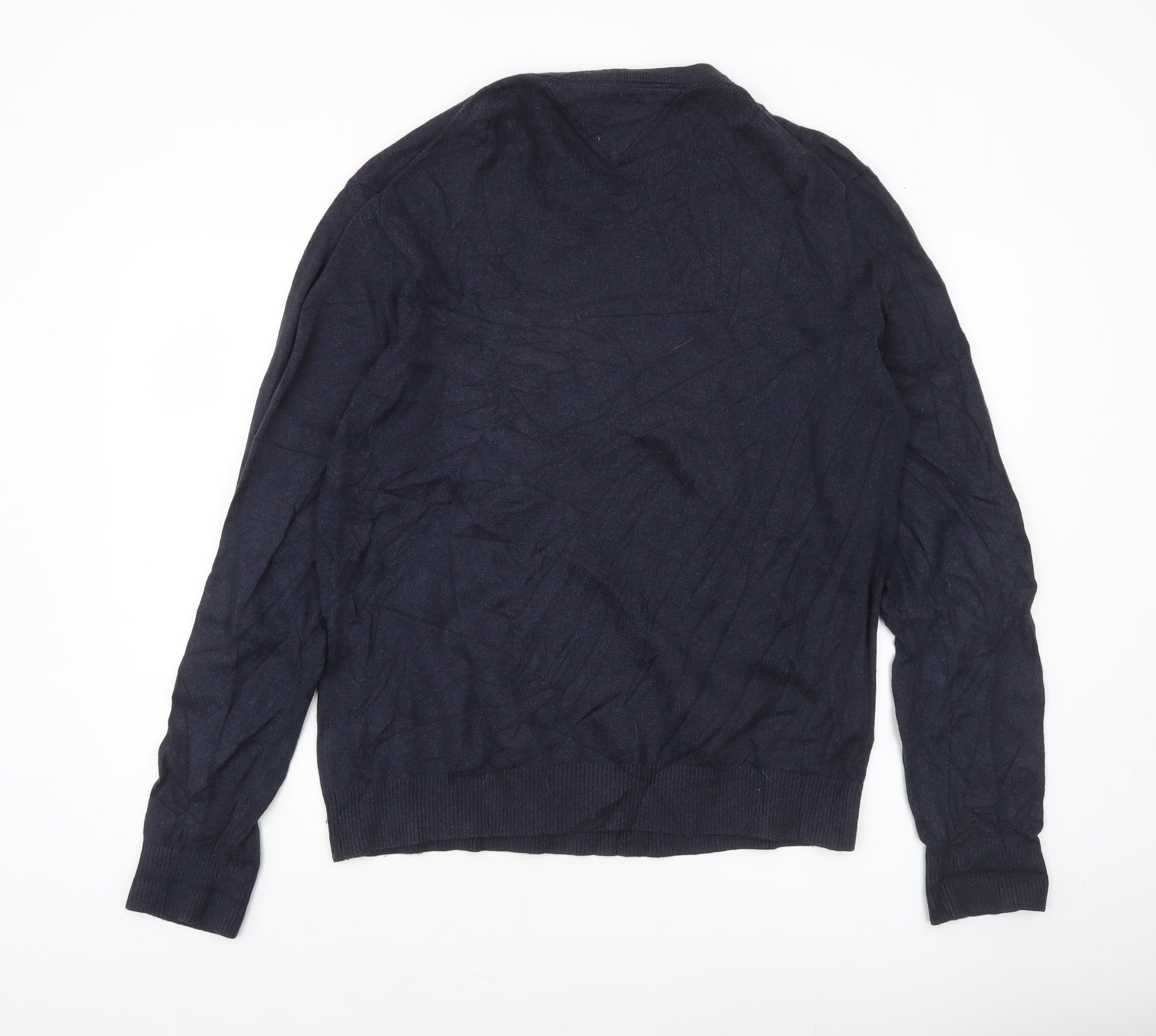 This refined Tommy Hilfiger men’s V-neck jumper combines timeless sophistication with modern comfort, making it a versatile piece for all seasons. Crafted from a luxurious blend of 92% Pima Cotton and 8% Cashmere, the fabric feels exceptionally soft against the skin while offering breathable warmth that’s ideal for layering. The rich navy-blue colour gives it a smart, understated look suitable for both casual everyday wear and smarter occasions. Designed in a Regular Fit, this knit pullover ensures a comfortable yet flattering silhouette with ribbed cuffs and hem providing structure. The fine tight-knit texture adds a smooth, polished finish, while the Tommy Hilfiger flag logo embroidered on the chest highlights the brand’s signature minimalist design. The long sleeves and V-neckline give it a classic shape that pairs effortlessly with shirts, jeans, or chinos.Perfect for autumn, winter, and early spring, this jumper transitions easily between workwear and leisurewear. Whether you’re layering it over a collared shirt for the office or wearing it solo for a relaxed weekend look, it delivers timeless style and dependable comfort. Breathable and lightweight, the jumper maintains shape and softness after multiple washes.Machine washable for easy care, this high-quality piece reflects Tommy Hilfiger’s commitment to craftsmanship and enduring style. In excellent used condition, showing only minimal creasing from storage, it’s ready to become a key addition to any man’s wardrobe — combining luxury feel, practical wear, and enduring appeal at an affordable price point.Ideal for someone seeking versatile, branded knitwear with a clean modern aesthetic, this Tommy Hilfiger jumper promises both elegance and durability. Whether you’re dressing up or down, it’s an investment piece that brings premium quality and timeless design to everyday wear.