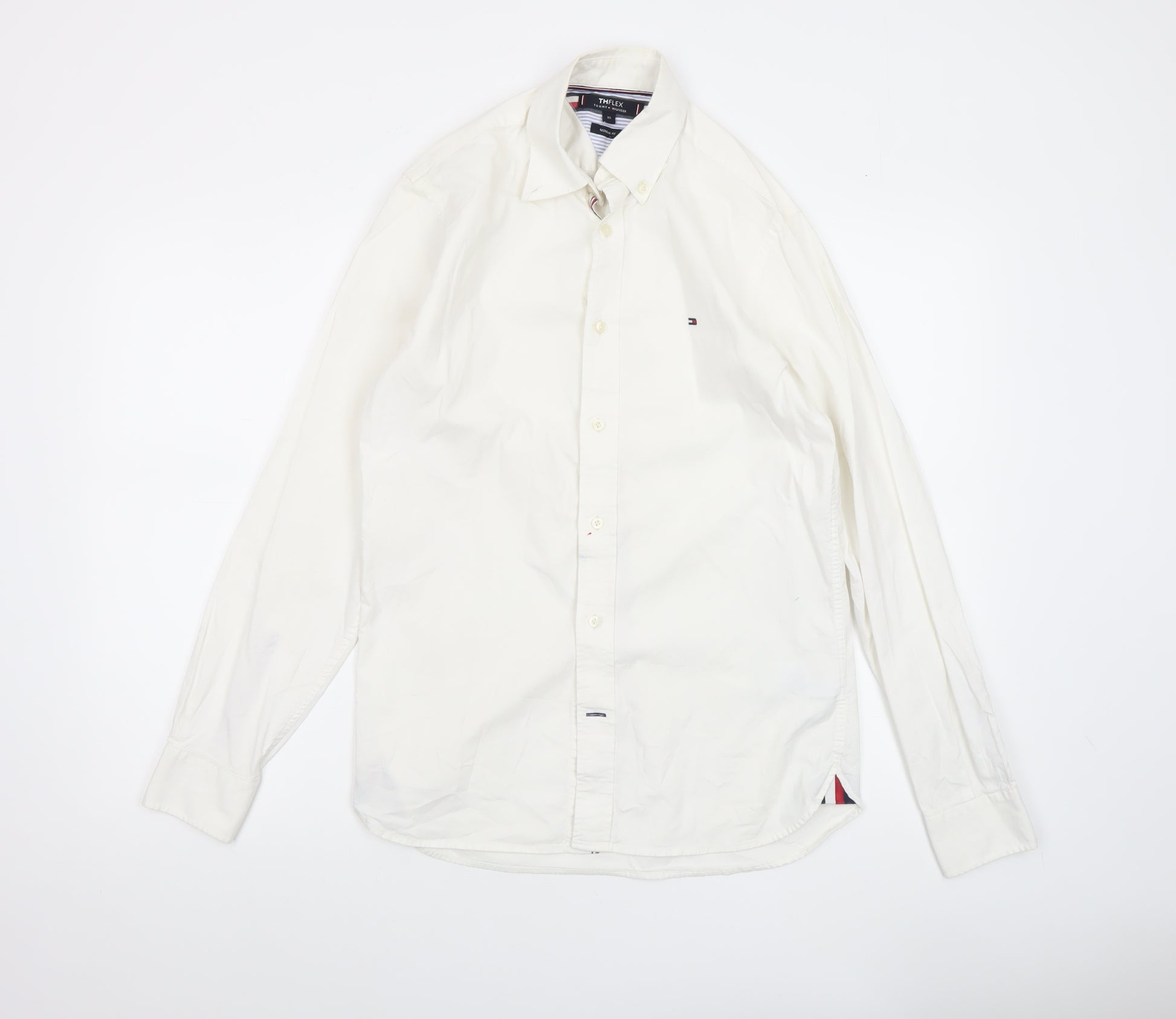 Perfect for effortless sophistication, this Tommy Hilfiger THFlex shirt combines classic tailoring with modern stretch comfort, making it an excellent choice for both smart and casual occasions. Crafted from a premium blend of 98% cotton and 2% elastane, this long sleeve shirt provides a soft, breathable feel with just enough stretch for all-day ease. The clean white hue delivers a timeless, versatile look that complements everything from chinos and jeans to tailored trousers. Designed with a button-down collar, it maintains a polished silhouette that sits well under blazers or worn alone for a more relaxed style. The classic button-up closure, embroidered Tommy Hilfiger flag logo on the chest, and branded contrast detailing inside the collar give it an unmistakable touch of signature refinement. The regular fit offers comfortable room through the shoulders and body, providing a flattering shape that doesn’t compromise on ease of movement. Ideal for transitional seasons like spring and autumn, as well as for layering through cooler months, this shirt works effortlessly in casual workplace settings or weekend gatherings. In very good pre-owned condition, showing only light signs of wear with minor creasing, it retains its high-quality appeal and structure. Machine washable for convenience, this shirt combines durability, timeless design, and contemporary style in one essential wardrobe staple. Pair it with chinos for a business-casual look, or wear it open over a tee for a relaxed day out. With its crisp fabric, subtle detailing, and premium craftsmanship, this Tommy Hilfiger THFlex shirt is a reliable go-to piece that elevates any outfit. A must-have addition for any man who appreciates understated style, comfort, and versatility.