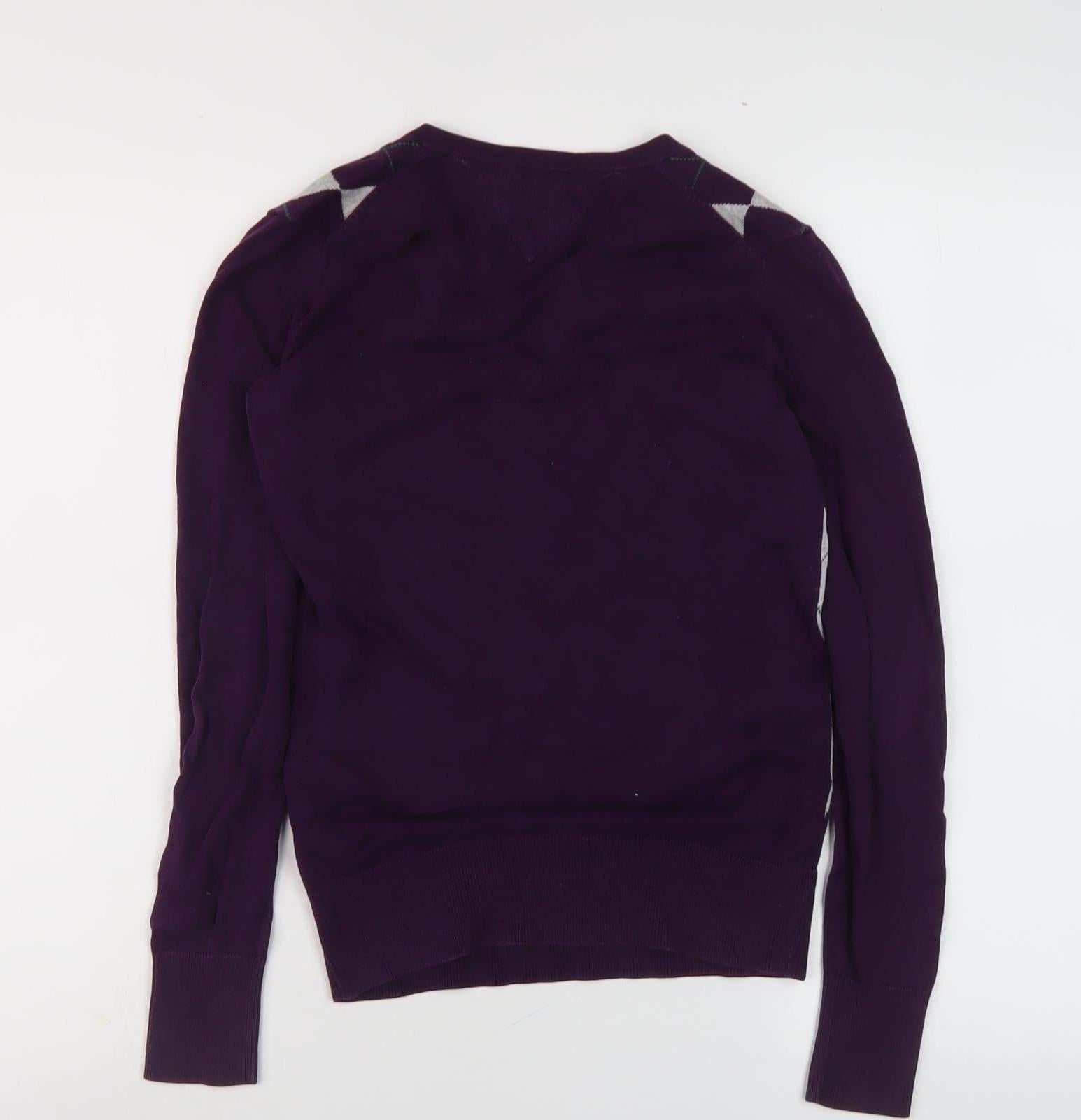Elevate your winter wardrobe with this stylish Tommy Hilfiger Women's Jumper, a perfect blend of classic design and modern comfort. Crafted from 100% high-quality cotton, this knit pullover promises both warmth and breathability, making it an ideal choice for the chilly Autumn and Winter months. The rich purple hue coupled with an Argyle/Diamond pattern adds a touch of sophistication and elegance, ensuring you make a statement wherever you go. Featuring a flattering V-neckline, this jumper is designed to enhance your feminine silhouette while providing ample room for layering over your favourite collared shirts or under jackets. The long sleeves offer added coverage, making it a versatile piece for both casual outings and laid-back office settings. This jumper's lightweight and machine washable fabric ensures easy care and maintenance, keeping it in top condition for seasons to come. In a size XS, this regular fit jumper fits true to size and is tailored to provide a comfortable and relaxed wear. Despite slight signs of wear consistent with previous use, this jumper remains in very good condition and is free from any significant damage. Its excellent craftsmanship ensures durability, allowing you to enjoy this chic piece for years. Priced competitively, this Tommy Hilfiger jumper is an affordable luxury that brings both style and comfort into your wardrobe, making it a must-have for any fashion-conscious individual.