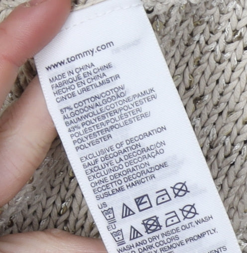 Elevate your casual wardrobe with this elegant Tommy Hilfiger pullover jumper. Tailored for women, this medium-sized, regular-fit piece is crafted in a comforting blend of cotton and polyester, offering durability and comfort that lasts. The beige hue pairs easily with a range of colours, making it a versatile addition to your collection. Featuring a round neck and short raglan sleeves, this jumper offers a relaxed yet chic look suited for various all-season occasions. The chunky-knit fabric is adorned with subtle sequins, adding a touch of sparkle that can take you from day to night effortlessly. Ideal for casual outings and relaxed gatherings, this jumper's lightweight nature ensures it can be layered during cooler months or worn alone during warmer spells. Easy to care for, it remains fresh and vibrant after each machine wash. Capture attention with its understated elegance, making it a must-have staple in any fashion-forward wardrobe.