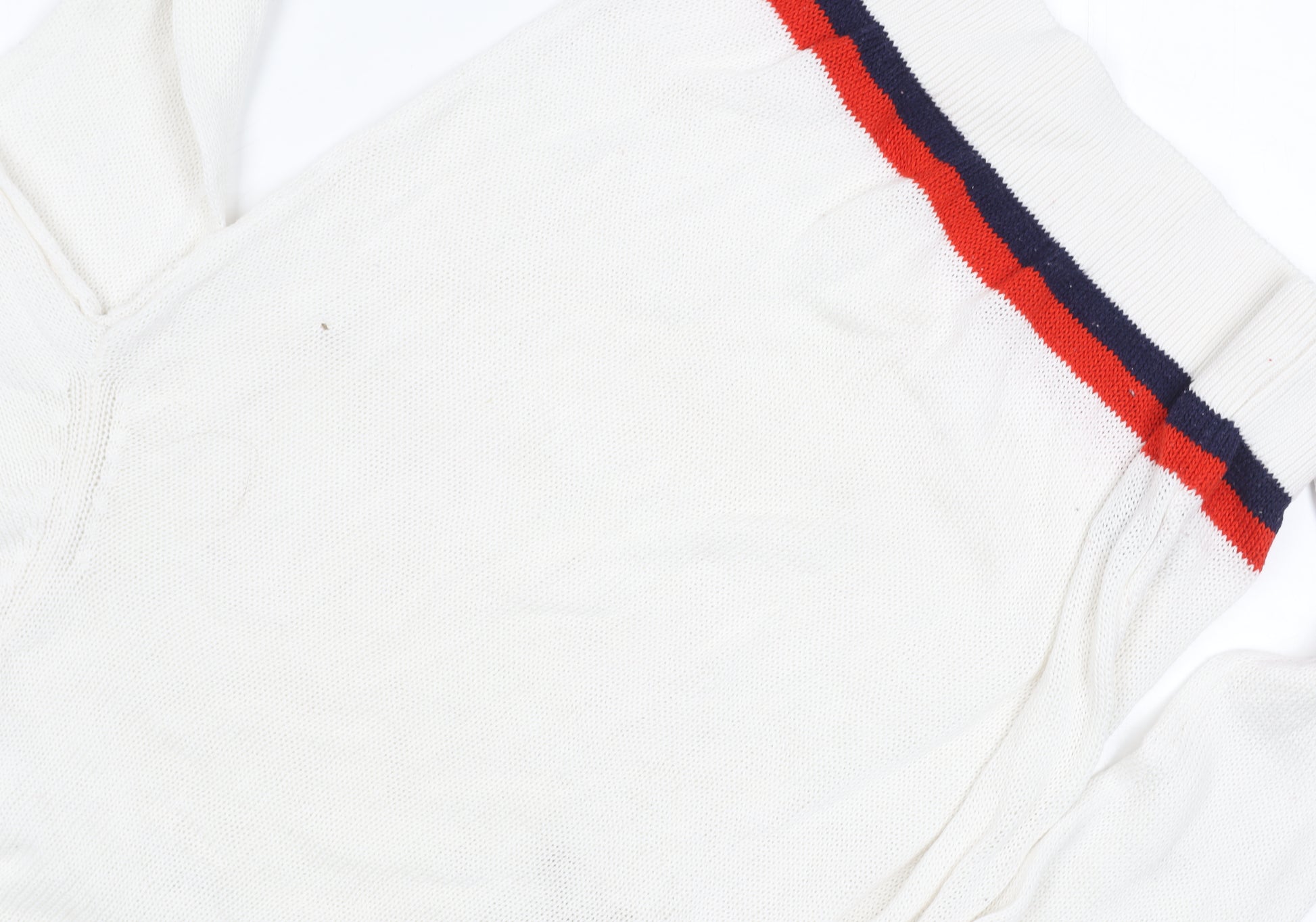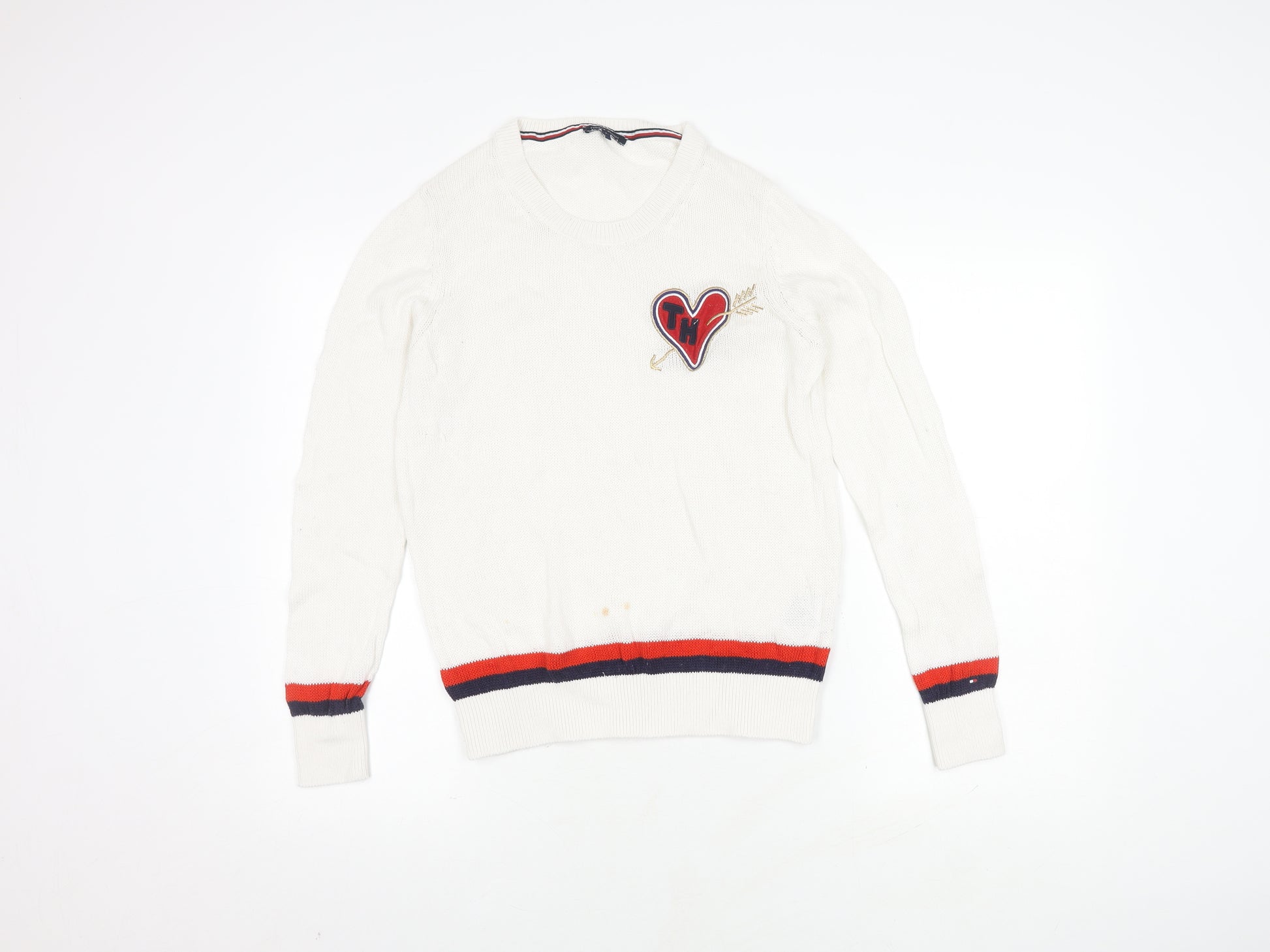 Step into style and comfort with this Tommy Hilfiger women's pullover jumper, perfect for casual occasions. Crafted from 100% cotton, this tight-knit fabric offers both breathability and warmth, making it ideal for year-round wear. Featuring a classic crew neck and long raglan sleeves, this jumper provides a relaxed and flattering fit for any body shape. The iconic Tommy Hilfiger logo accentuates its timeless design, a tribute to the brand's rich heritage. In versatile white, it pairs effortlessly with jeans or skirts, offering endless styling options. Despite some slight stains, this used jumper retains its shape and quality, ensuring it’s ready to be cherished in your wardrobe. Machine washable for convenience, its durable fabric promises longevity. Enhance your look with this logo-adorned piece, resonating both style and practicality.