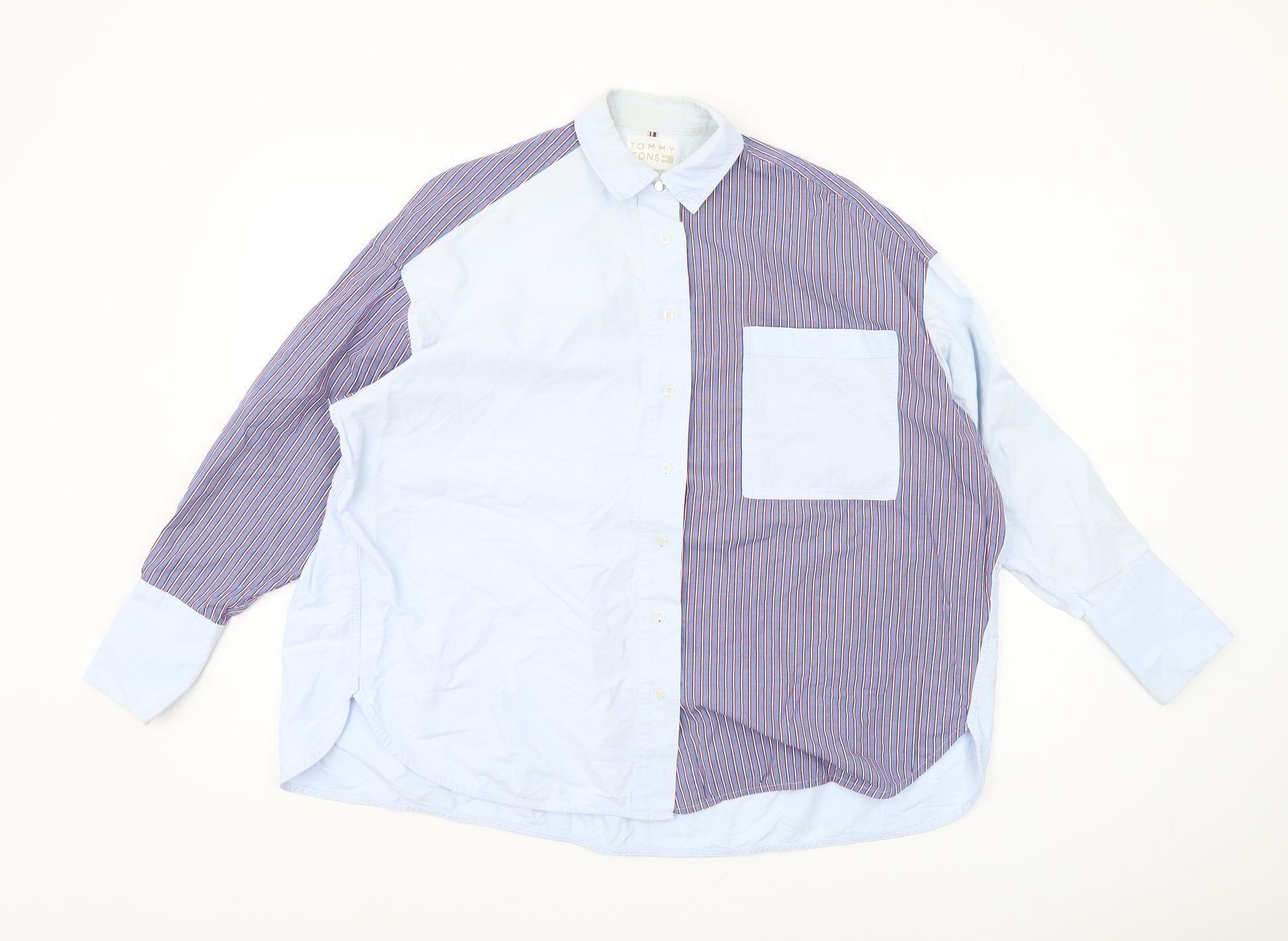 Discover the perfect blend of style and comfort with this Tommy Icons Women's Blue Striped Button-Up Shirt. Crafted in luxurious cotton, this shirt offers a soft and breathable feel. Its smart collared neckline and distinct button-up design make it a versatile piece for any woman's wardrobe. The long sleeves with raglan styling add a touch of elegance and offer a flattering fit. Ideal for casual occasions, this shirt features a striking striped pattern that effortlessly complements any outfit. Easy to care for, it's machine washable ensuring the vibrant blue remains bright wear after wear. In excellent condition, with only a slight wrinkle in the fabric, this shirt is perfect for those who appreciate stylish yet practical fashion. Elevate your everyday look with this chic Tommy Icons piece.