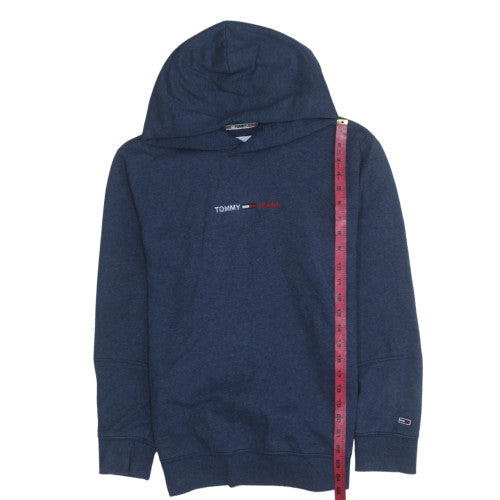 Upgrade your casual look with this blue pullover hoodie from Tommy Jeans. Designed for a regular fit, this men’s hoodie combines classic comfort with modern style. Crafted from a soft and durable cotton and polyester blend, it provides both warmth and breathability for all-season wear. The fleeced fabric interior ensures extra comfort while the bold embroidered Tommy Jeans logo detail adds a stylish finish to your everyday outfit. Featuring a spacious hood, ribbed cuffs and hem, and long sleeves, this hoodie is perfect for layering or wearing on its own. Ideal for casual outings, lounging, or weekend wear, it is versatile enough to pair with jeans or joggers. Machine washable for easy care, this reliable wardrobe staple is built for everyday use. The high-quality fabric blend offers shape retention and softness wash after wash. In a rich navy-blue shade, this piece embodies simplicity with a touch of iconic branding that fits effortlessly into any modern wardrobe. A comfortable choice for autumn and winter, but suitable for year-round wear. Condition is excellent, showing minimal signs of previous use and no visible flaws. Perfect for those who appreciate stylish comfort and brand heritage, this Tommy Jeans pullover hoodie delivers the ideal balance of practicality and timeless appeal. Add this high-quality piece to your collection today for a mix of comfort, durability, and signature designer charm. Suitable for men seeking effortless, casual fashion with a refined edge.