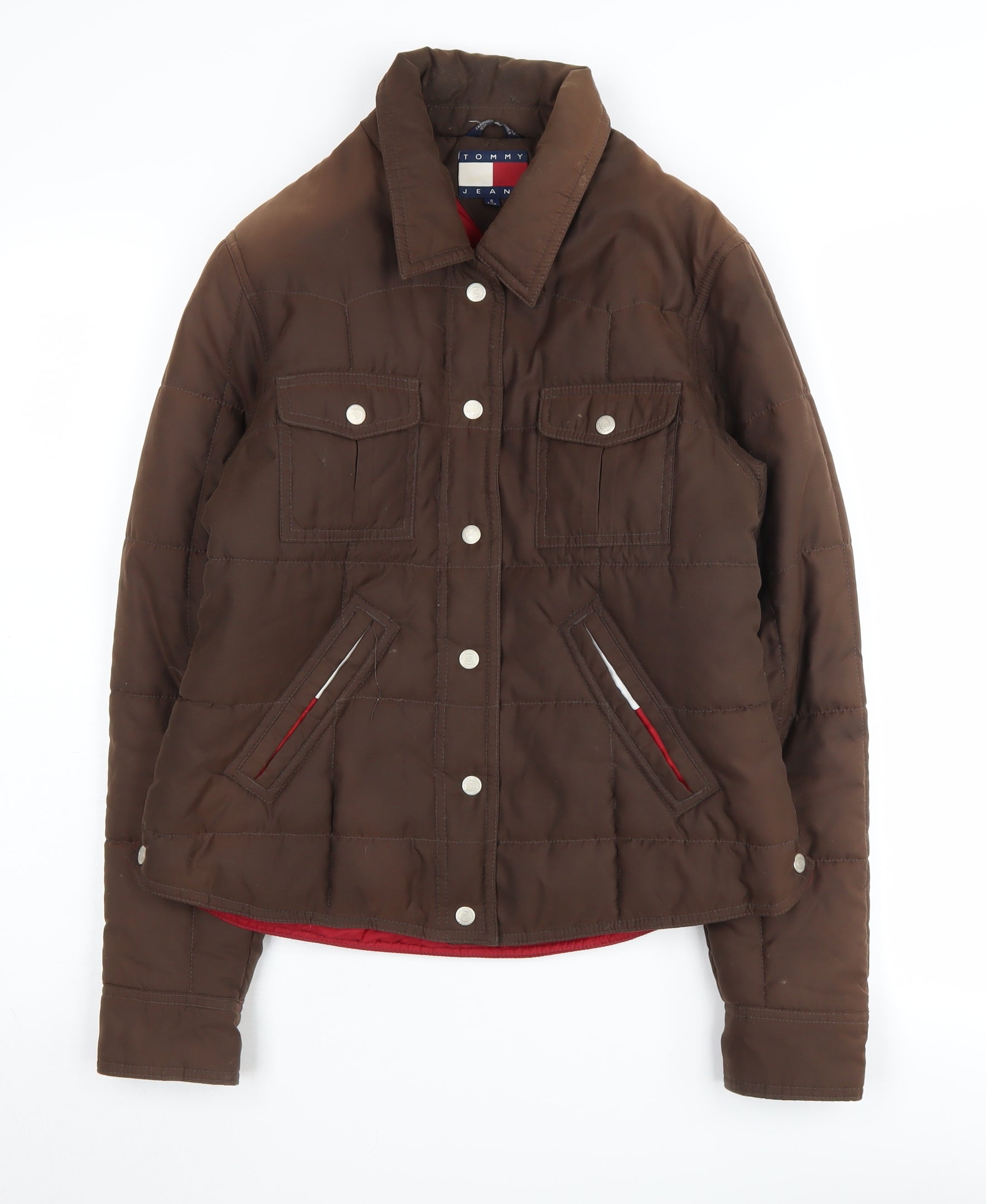 Embrace the colder months in style with this classic women’s puffer jacket from Tommy Jeans. Crafted from durable polyester, this brown jacket is designed for warmth and comfort. The short length and tailored regular fit make it perfect for casual occasions and everyday wear. Featuring long sleeves, a snap closure, and practical pockets, this jacket combines functionality with timeless design.Lined with nylon, it provides an extra layer of insulation, especially ideal for autumn and winter seasons. The smooth twill fabric ensures a sleek silhouette, while the absence of a pattern keeps the look sophisticated. Accented with buttons, the jacket remains versatile enough to complement any wardrobe. Pair it with jeans and boots for a complete, stylish winter ensemble.This excellent condition piece, without original sales tags, shows slight wear but no obvious signs of damage. Perfect for those seeking a classic aesthetic without compromising on warmth and comfort.