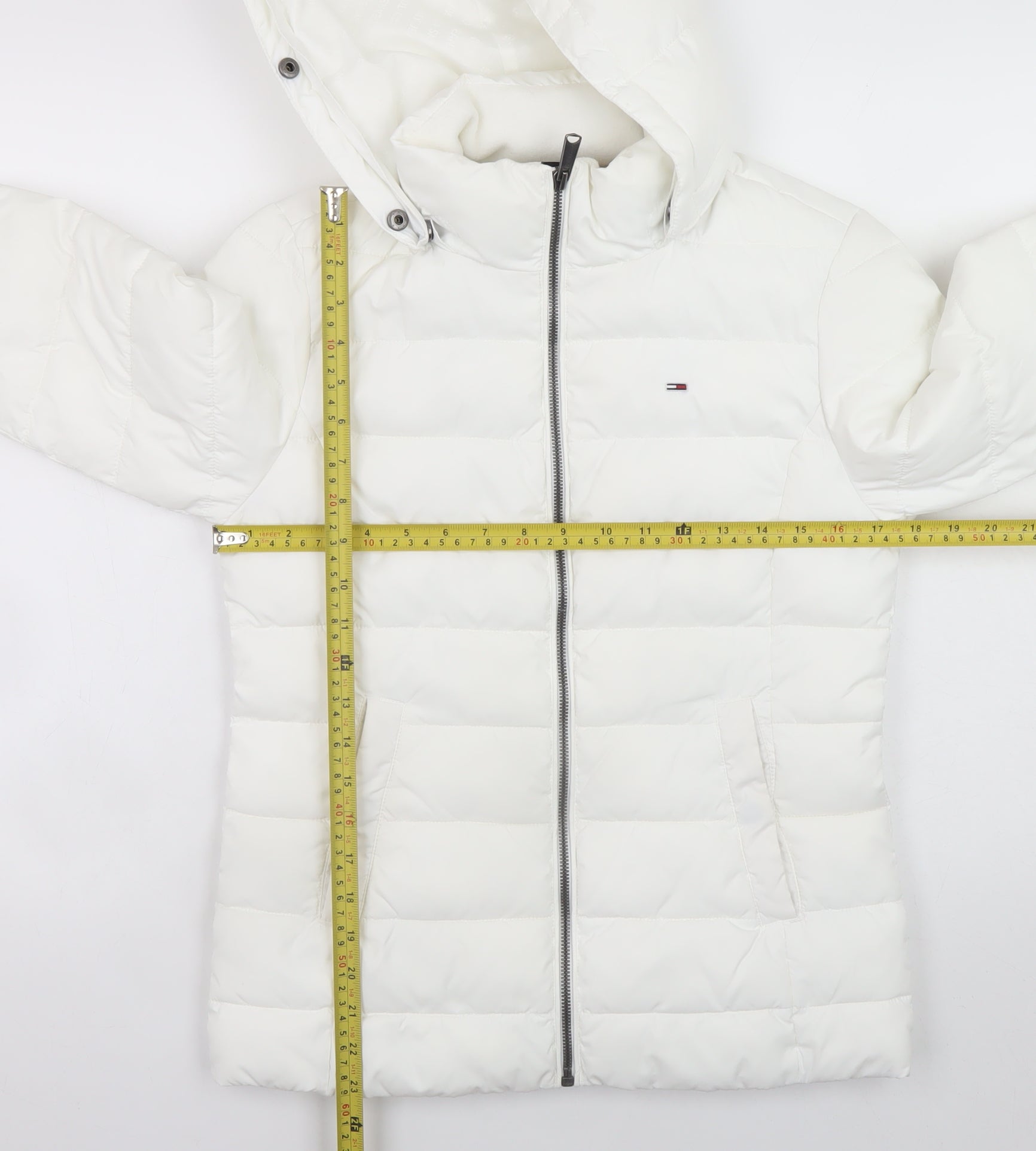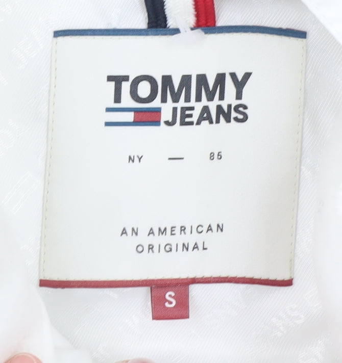 Stay stylish and cosy through the colder months with this stunning Tommy Jeans women’s white hooded puffer jacket. Featuring a lightweight yet warm design, this mid-length jacket is perfect for layering during winter and autumn. Designed in a crisp white shade, it embodies classic Tommy Jeans minimalism, enhanced by discreet logo detailing on the chest and sleeve. The jacket’s durable polyester outer shell blended with a touch of elastane ensures a comfortable fit with just the right amount of stretch. Its synthetic insulation adds warmth without extra weight, making it ideal for both daily wear and travel. The full zip front allows for easy wear and adjustable comfort, while the attached hood provides added protection from wind and light showers. Lined with smooth polyester, the jacket ensures a soft and cosy interior feel. Two side pockets add practicality, keeping your hands warm or essentials close to hand. The quilted finish gives it a timeless puffer aesthetic that’s effortlessly stylish and pairs perfectly with jeans, leggings, or casual dresses. Whether you’re heading to the city, on a weekend getaway, or just braving chilly commutes, this Tommy Jeans jacket provides dependable warmth while maintaining a sleek silhouette. Its versatile design makes it a must-have for every modern wardrobe. As a high-quality piece in excellent condition with no visible marks, it offers both luxury and value. This women’s small size perfectly fits a regular silhouette, offering ease of movement and flattering shape. A brilliant addition for those seeking a dependable, fashionable jacket that transitions seamlessly from day to night. Invest in this designer puffer jacket and elevate your outerwear collection with authentic Tommy Jeans flair — combining function, fashion and comfort all season long.