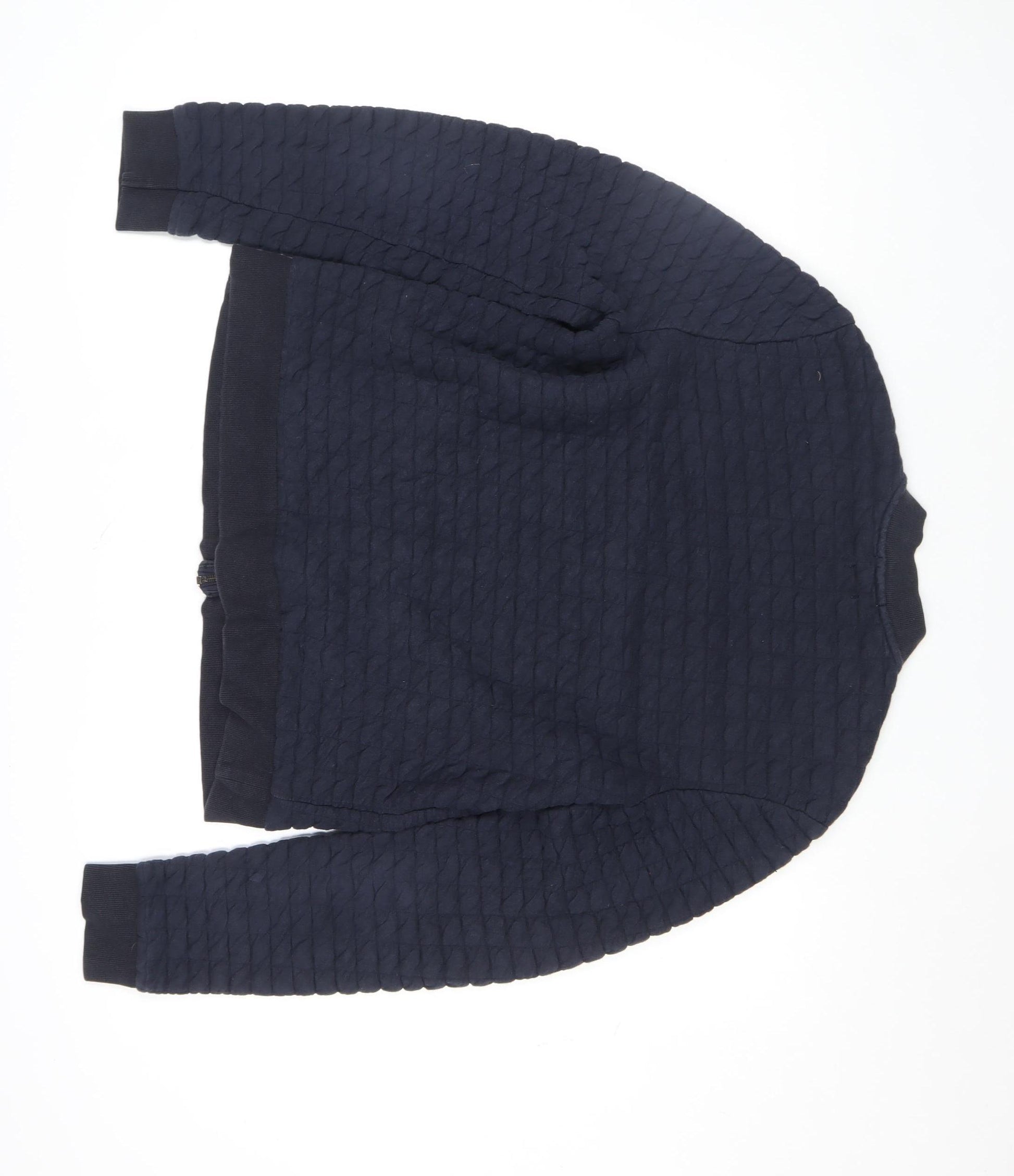 Upgrade your casual wardrobe with this stylish men’s quilted bomber jacket by Topman. Crafted from a soft blend of cotton and polyester, this jacket has a comfortable lightweight feel while retaining structure and shape. The outer shell features a subtle quilted texture, adding depth and a modern edge to your outfit. Designed in a classic navy blue, this versatile jacket pairs effortlessly with jeans, chinos, or joggers for a relaxed yet polished look. The jacket includes a full zip fastening and two functional side pockets, providing both practicality and a sleek appearance. Its ribbed cuffs, collar, and hem ensure a secure and comfortable fit that keeps the cold out. The inner lining is soft and breathable, making this piece suitable for layering during transitional weather in spring or autumn. Topman’s renowned attention to detail is evident in the stitching and the classic fit design, offering a regular silhouette that flatters most body types. Perfect for everyday wear, weekend outings, or casual workdays, this bomber jacket balances comfort with contemporary style. The midweight knit texture makes it ideal for cool days and evenings when you need an extra layer without adding bulk. Its simple yet modern design means it will remain a wardrobe staple for years to come. Gently used and in very good condition, showing only minimal surface wear consistent with careful use, this jacket is ready to bring instant style to your outfits. Whether you’re heading into town or grabbing a drink with friends, this Topman bomber jacket delivers that effortless smart-casual appeal that’s easy to love. Don’t miss your chance to add this timeless piece to your collection at an excellent used price.