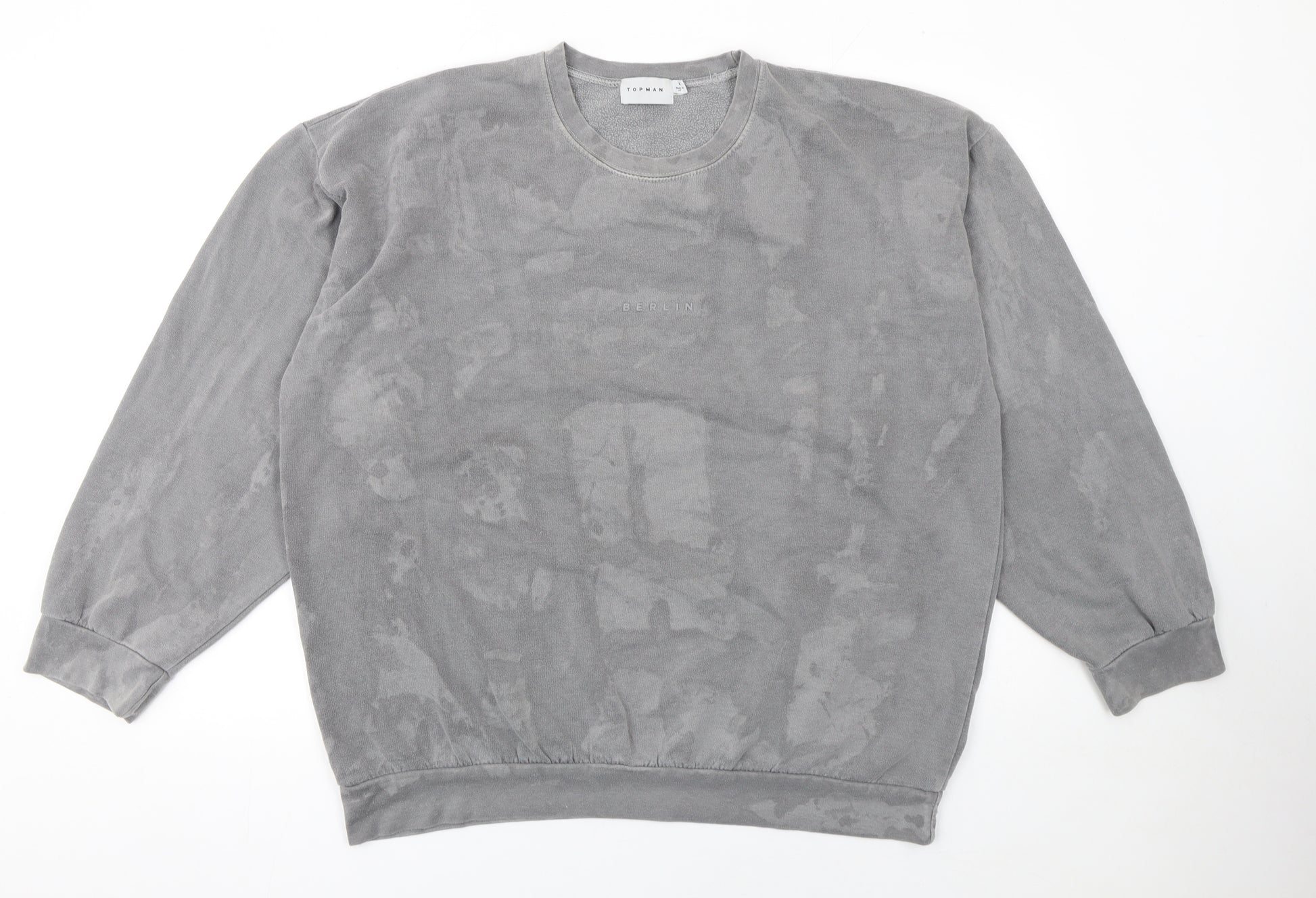 This stylish Topman men’s sweatshirt is a versatile addition to any casual wardrobe, offering a modern minimalist touch with exceptional comfort. Designed in a neutral grey hue, it features subtle tonal patterning that gives a unique washed effect, ideal for pairing with jeans, chinos or joggers. The centre chest is finished with a small embroidered 'Berlin' logo, adding an understated urban appeal. Made predominantly from cotton with a touch of polyester, the fleece fabric provides a soft, cosy interior and lightweight feel, making it ideal for everyday wear across autumn, winter and early spring. The regular fit cut ensures comfort and ease of movement, while the crew neck and ribbed cuffs deliver a classic finish. This sweatshirt has an easy pullover style, perfect for layering under a jacket or wearing on its own. It’s machine washable for convenience, maintaining its shape and colour with proper care. The condition is excellent with only light signs of wear and minimal fading, showing it has been well maintained. Whether you’re heading out for a relaxed weekend, a meet-up with friends, or simply lounging at home, this Topman grey fleece sweatshirt balances urban edge with all-day comfort. Elevate your off-duty style with this effortlessly cool wardrobe essential.