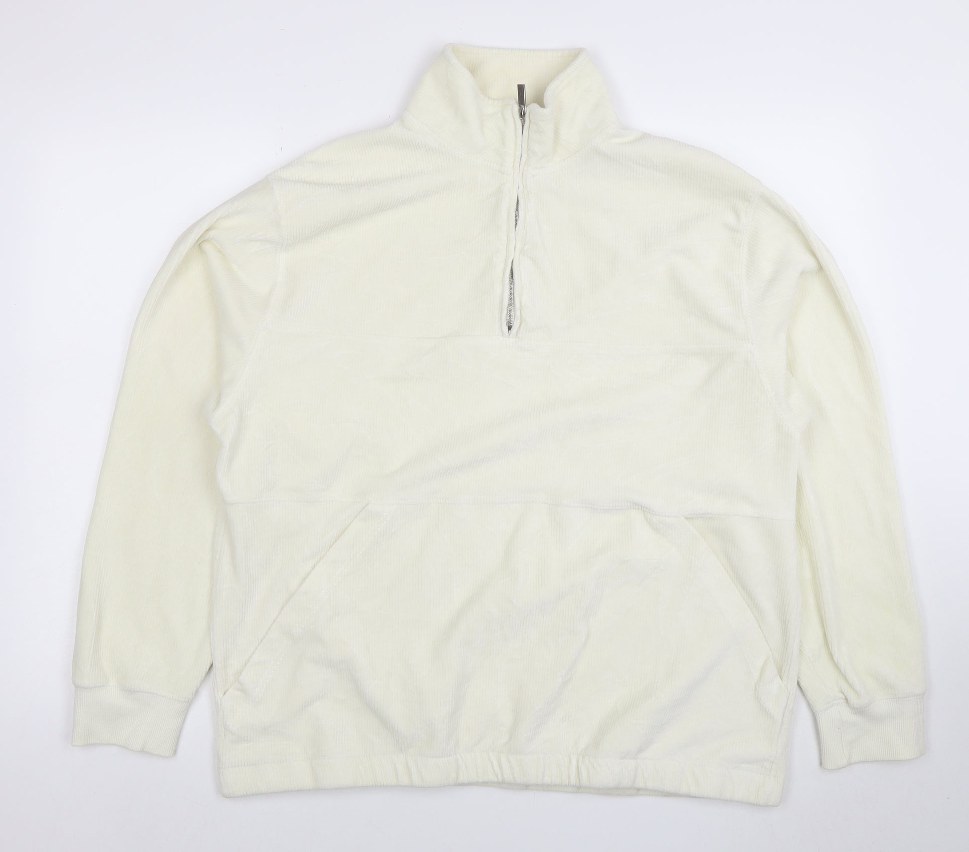 This men's ivory corduroy quarter-zip sweatshirt from Topman combines a refreshing balance of casual comfort and contemporary style. Crafted from a soft cotton blend with a hint of elastane, it offers flexibility and ease of wear, ensuring lasting comfort throughout the day. The rich corduroy fabric gives it a subtly textured appearance, elevating the classic sweatshirt style into something more refined yet relaxed. Featuring a practical half zip closure at the neckline, it can be worn fully zipped for warmth or partially open for a more laid-back look. Designed with long sleeves, ribbed cuffs, and a comfortable elasticated hem, the sweatshirt ensures a neat and tidy fit. The front kangaroo-style pockets add both functionality and aesthetic balance, perfect for keeping hands warm or storing essentials. Its neutral ivory tone makes it easy to pair with a wide range of outfits, whether styled with dark jeans, chinos, or joggers. Ideal for cooler days in autumn, winter, and early spring, this Topman sweatshirt transitions seamlessly from casual weekends to smart-casual everyday wear. The condition is very good with only a minor light mark, a small detail that does not detract from its overall appearance or quality. Machine washable and easy to care for, it’s perfect for anyone who values effortless style with minimal maintenance. Add a subtle touch of sophistication to your off-duty wardrobe with this comfortable, practical piece that showcases Topman’s signature blend of modern design and timeless appeal.