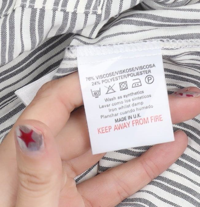 This Topman men’s striped shirt is a versatile wardrobe essential that combines comfort, style and effortless wearability. Crafted in the UK with a breathable blend of 76% viscose and 24% polyester, this shirt offers a soft and lightweight feel, perfect for everyday wear. Designed in a classic black and white striped pattern, it exudes modern sophistication while retaining timeless appeal. Featuring long sleeves, a button-up front, and a smart band collar style, it blends casual and smart-casual aesthetics with ease. The cut ensures a regular fit, suiting most body types comfortably. With a chest size of 40 inches (UK Medium), it provides a flattering silhouette without compromising movement. The collarless neckline complements the striped design, making it an ideal piece for layering or wearing on its own. This shirt is machine washable for easy care, a practical choice for modern lifestyles. Suitable for spring, summer and autumn, it pairs well with jeans, chinos or tailored trousers, making it versatile for casual outings, evening gatherings or weekend wear. While in excellent pre-owned condition, it has been well-maintained with no visible flaws such as stains or tears, ensuring it delivers great value. Accented with simple button detailing and a pocket, it enhances both function and style. Whether you’re updating your staple wardrobe or looking for a lightweight shirt with breathable comfort, this Topman button-up remains a sleek choice. Affordable, stylish and adaptable, this shirt is the perfect addition for those who appreciate quality casual fashion.