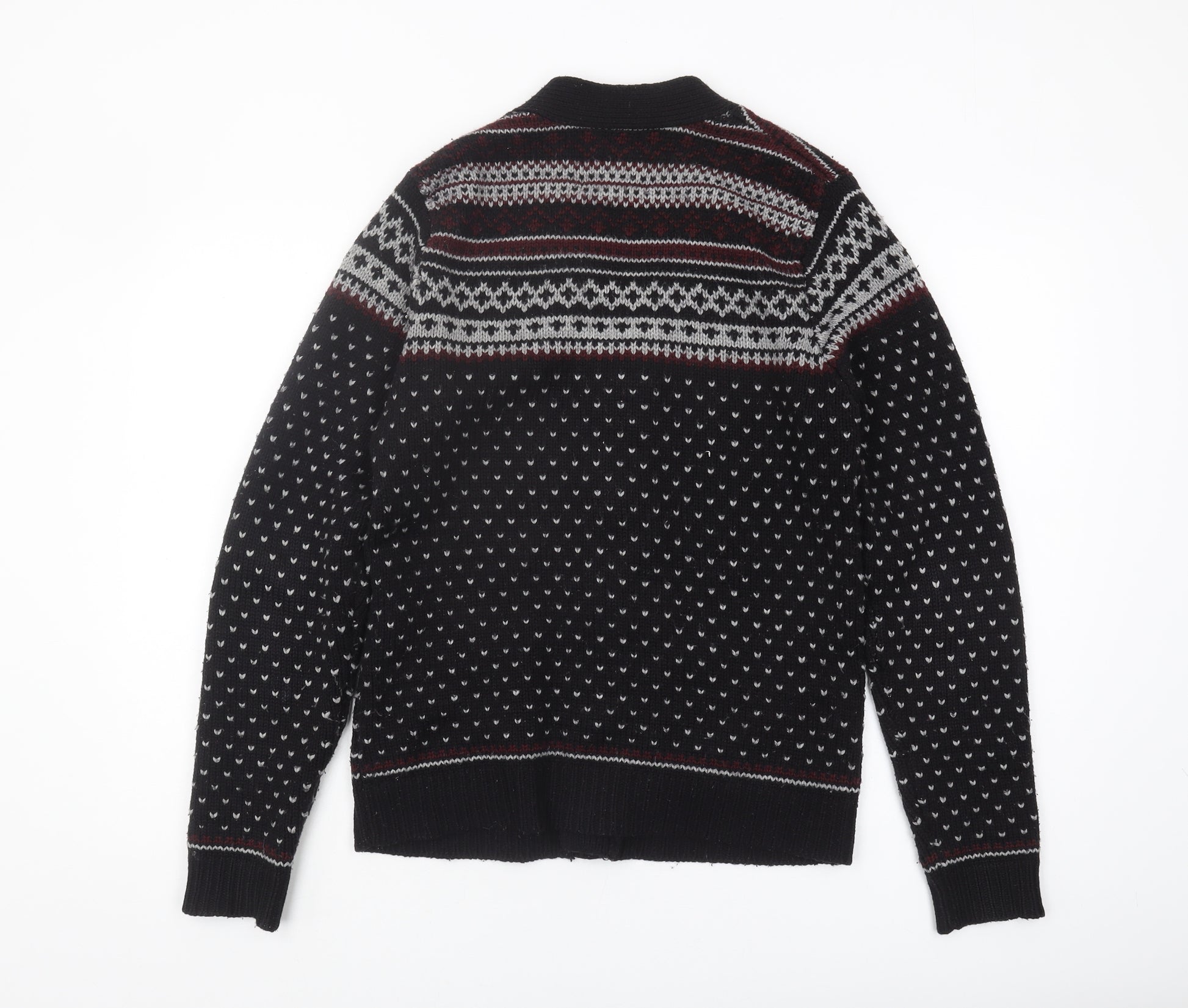 Embrace the cosy warmth and timeless style of the Topman Men's Black Fair Isle Cardigan. Perfectly crafted for the modern man, this cardigan in a medium size serves as a versatile addition to your winter wardrobe. Made from a high-quality blend of 73% acrylic and 27% wool, it promises both durability and comfort. The tight-knit fabric with a classic Fair Isle pattern adds a touch of sophistication, while the button accents and V-neck design enhance its classic appeal. Ideal for layering during autumn and winter, this heavyweight cardigan is both stylish and functional with added pockets for convenience. Whether you're lounging at home or heading out for a casual outing, this elegant cardigan meets all your style needs, ensuring you stay warm and fashionable. Easy to care for, simply throw in your wash for convenient upkeep. With no visible damage or stains, this piece is in excellent condition, ready to be worn and admired. Elevate your wardrobe with this Topman cardigan, a blend of tradition and modernity, ideal for any casual occasion.