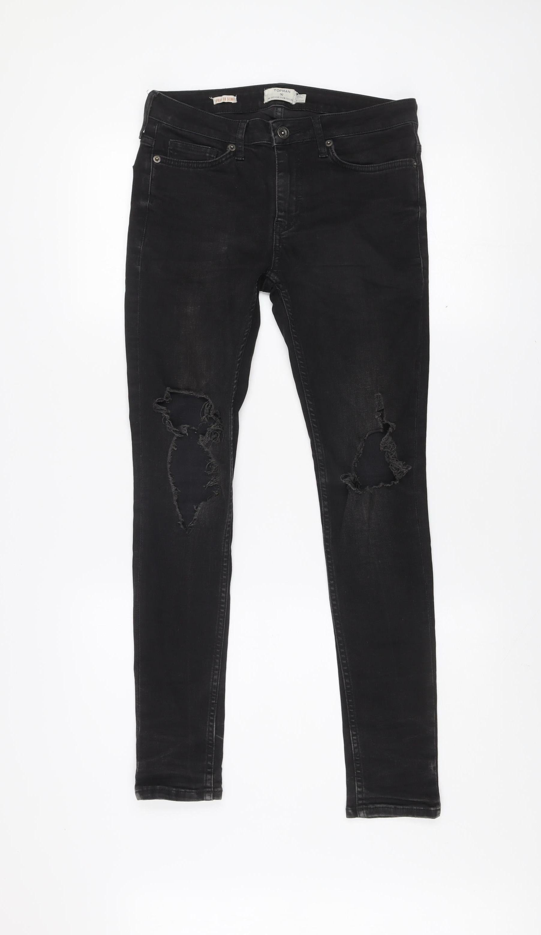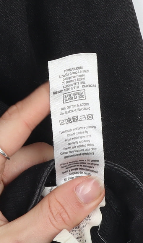 Step up your casual style with these fashionable Topman men's black skinny jeans, designed to combine a modern aesthetic with all-day comfort. Crafted from a high-quality blend of 99% cotton and 2% elastane, these jeans offer a sleek fit and a subtle stretch that moves with you. The premium denim fabric delivers durability while maintaining a soft feel, making them a staple in any modern wardrobe. Featuring a contemporary distressed design with rips at the knees, these jeans add an effortless edge to your outfit, ideal for casual days or nights out. Finished with a classic five-pocket style and a zip and button closure, they maintain the traditional jean structure with a modern twist. The black colour wash enhances their versatility, easily pairing with everything from graphic tees to crisp shirts. These jeans are mid-rise and styled in a slim, skinny cut that flatters the silhouette while keeping a relaxed yet rock-inspired appeal. As a comfortable and durable piece, they can be easily cared for with a machine wash at 30°C, ensuring they stay looking their best. The grunge-inspired distressing gives them an effortlessly cool look that suits any urban style enthusiast. Whether worn with trainers or boots, they offer a fashionable balance between rugged and refined. Ideal for spring, summer, or autumn wear, this pair of Topman jeans represents the perfect blend of practicality and sharp design. Though gently used, they remain in very good condition, showing only minor signs of wear consistent with light use. Don’t miss the opportunity to add these Topman distressed skinny jeans to your denim rotation—perfect for those who appreciate comfort, fit, and bold modern styling.