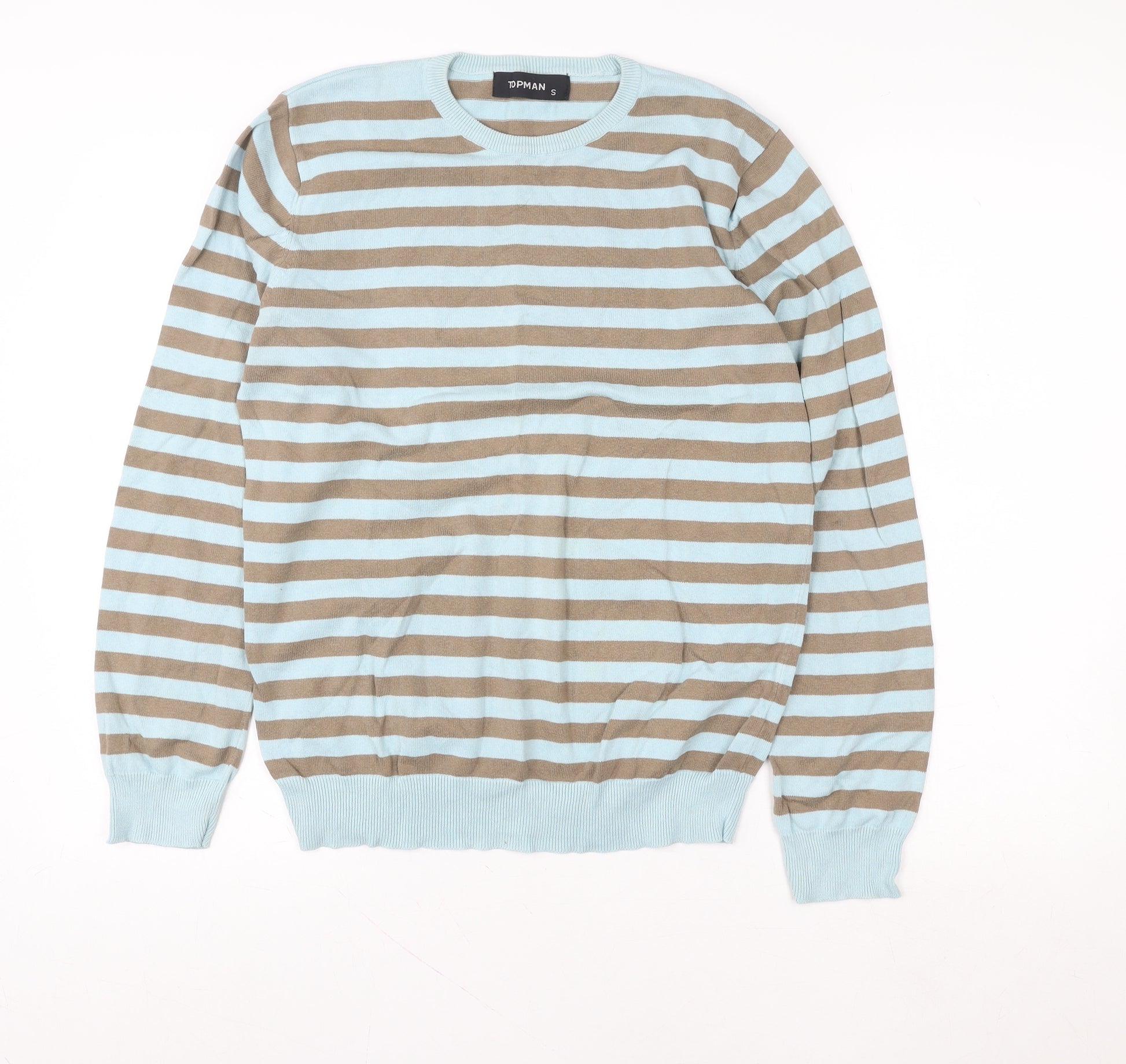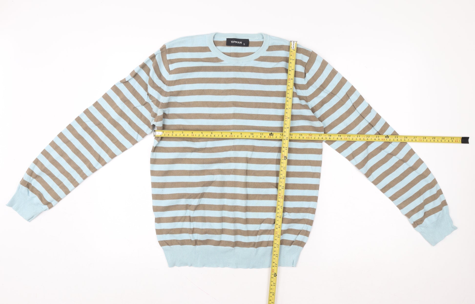 Add a touch of casual charm to your everyday wardrobe with this stylish Topman men’s brown and blue striped pullover sweatshirt in size Small. Designed for comfort and contemporary style, this piece offers a classic crew neck silhouette, bringing a timeless appeal that pairs perfectly with jeans, chinos, or shorts. The alternating brown and light blue stripes create a subtle yet eye-catching contrast that offers a fresh take on everyday wear. Made from a soft knit fabric blend of cotton and polyester, this sweatshirt provides both breathability and gentle stretch for lasting comfort throughout the day. Its lightweight construction makes it an ideal choice for layering in autumn and spring, or wearing solo during cooler summer evenings and milder winter days. Featuring long sleeves and ribbed detailing at the cuffs and hem, this pullover ensures a neat fit while maintaining a relaxed silhouette. Perfect for casual outings, weekend wear, or laid-back evenings, it brings together style and comfort effortlessly. Machine washable for easy care, it’s designed to withstand frequent wear while retaining its shape and softness. The condition is excellent, showing only light general wear and no notable flaws, making it a fantastic addition for those looking for an affordable, pre-loved wardrobe upgrade. Whether you style it over a crisp shirt for a smart-casual look or pair it with joggers for a relaxed appeal, this versatile Topman sweatshirt delivers understated confidence and effortless charm. Invest in a reliable piece of knitwear that blends quality, comfort, and contemporary style in one go. Ideal for men who appreciate everyday essentials that look good and feel great, this striped pullover is a wardrobe staple sure to become a favourite for seasons to come.
