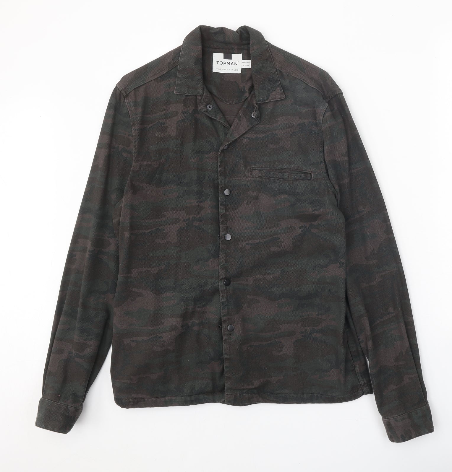 Mens Brown Camouflage Cotton Button-Up Size XS Collared Snap