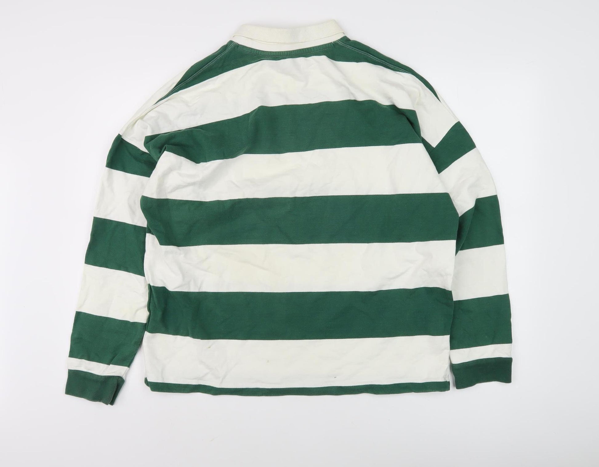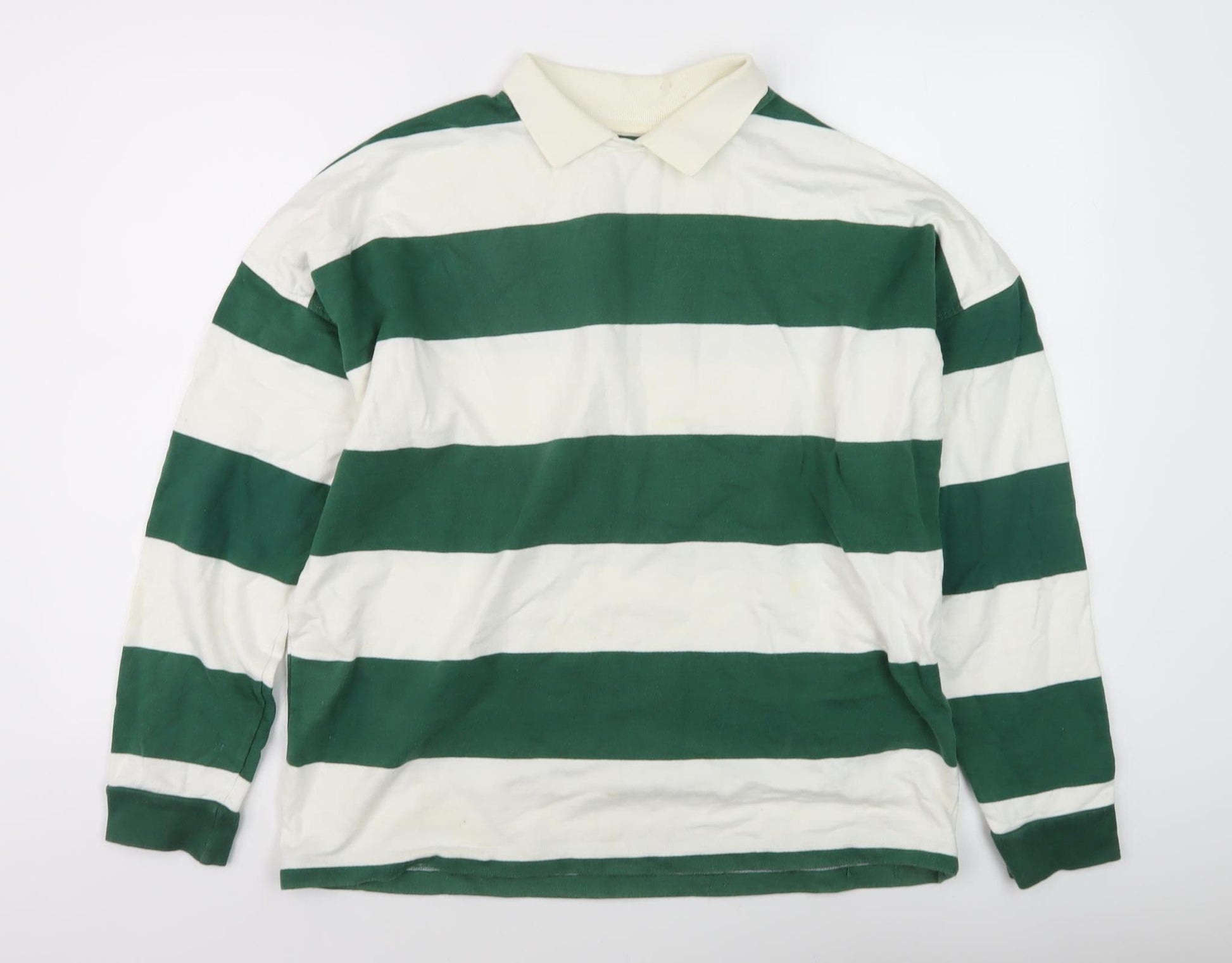 Elevate your casual wardrobe with this Topman men's collared sweatshirt, featuring a bold green and white striped pattern. Crafted from soft cotton, this lightweight long sleeve top offers exceptional comfort and breathability, making it an ideal choice for both autumn and spring. The classic collared neckline adds a touch of sophistication, while the relaxed fit ensures ease of movement throughout the day. Perfect for layering or wearing on its own, this versatile piece can be dressed up with chinos for a smart casual look, or paired with jeans for a laid-back weekend style. Although pre-owned, it is in excellent condition, showing no signs of wear. Available in size XS, this striking sweatshirt promises to add a pop of colour to your ensemble effortlessly. Suitable for various occasions, it’s a must-have addition to any modern man's wardrobe. Don’t miss out on the opportunity to make this stylish and comfortable Topman sweatshirt yours.