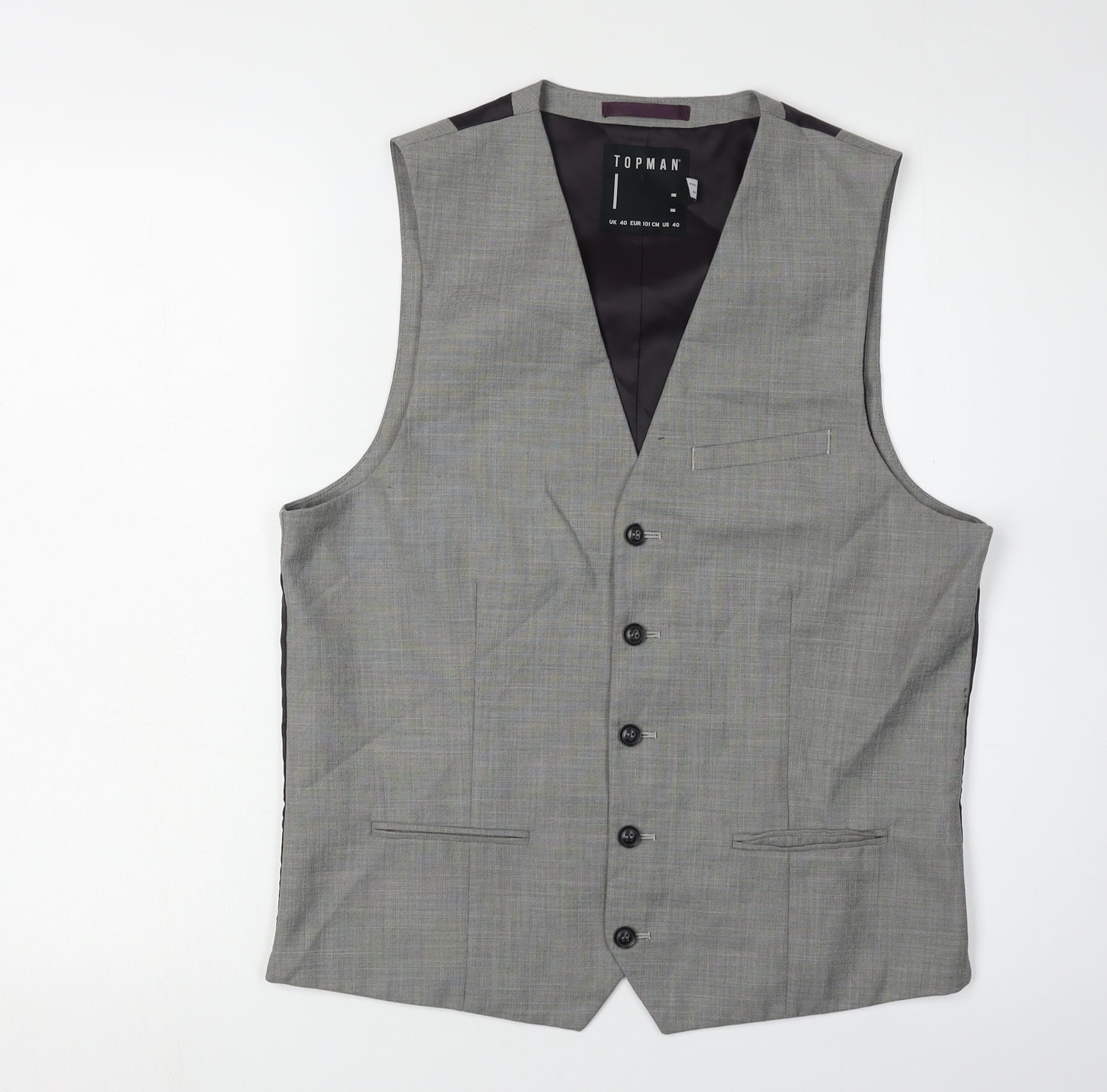 This elegant grey suit waistcoat from Topman is a versatile addition to any wardrobe, perfect for creating both formal and smart-casual looks. Crafted from a blend of 87% polyester and 13% viscose, it offers a comfortable yet stylish fit. The subtle check pattern enhances its modern appeal, making it suitable for various occasions. The five-button front design adds a classic touch, while the perfect regular size 40 ensures a comfortable fit. Pair this waistcoat with a crisp shirt for a sharp business look or wear it with a fitted t-shirt for a more laid-back vibe. With its professional dry clean only care, this waistcoat is easy to maintain and ideal for frequent wear. Don't miss out on adding this versatile piece to your collection.